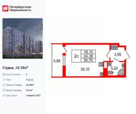 Продается уютная студия от застройщика в жилом комплексе ''Бионика Заповедная'' в динамичном Приморском районе.До метро можно добраться на транспорте всего за 11 минут.Удобная, классическая, функциональная европланировка, вместительная прихожая 3 м². Общая площадь студии - 24.3 м², жилая 18 м², высота потолка 2.77 м.Квартира продается с отделкой ''Норд Лайн светлый плюс''.Что особенного в ЖК ''Бионика Заповедная''?• Оазис в городе 3 минуты пешком до Новоорловского заказника (140 ГА)• Захватывающие виды из окон на хвойный лесопарк• Всесезонный ''Заповедный парк'' во дворе площадью 23000 кв.м.• 5 единых входных групп с авторским дизайном и лаундж-зонами, сити-виллы на первых этажах с палисадниками и высотой потолков до 4 м• Места притяжения: фонтан ''Бионика'', спортивный кластер со скейт-парком, фотозоны с арт-объектами