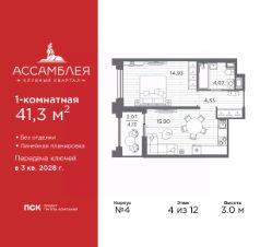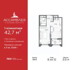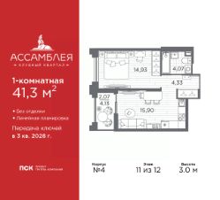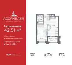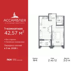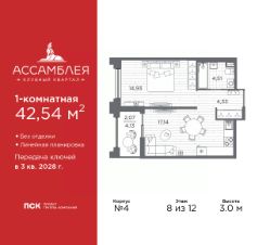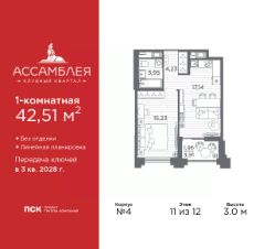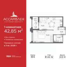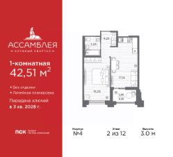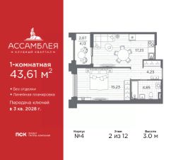 Просторная 1-комн. квартира в Клубный квартал ''Ассамблея'' на 2 этаже. Квартира без отделки, новый владелец может сделать ремонт по индивидуальному дизайн-проекту. Общая площадь: 43.61 кв.м., жилая: 15.23 кв.м., площадь просторной кухни-столовой: 17.23 кв.м. Все окна выходят на одну сторону. В квартире одна лоджия, один совмещенный санузел. Высота потолков 3.0 м. Дом монолитный, трехподъездный, высотой 12 этажей. Квартира находится в 3-й секции в корпусе 4. На этаже 9 квартир. В подъезде 1 пассажирский и 1 грузовой лифт. Начало строительства - 3 квартал 2025 года. Окончание строительства - 3 квартал 2028 года. Оформление сделки по договору долевого участия. В шаговой доступности от жилого комплекса расположены станции метро (расстояние по прямой): ''Горный институт'' (1.0 км), ''Василеостровская'' (1.4 км), ''Приморская'' (1.5 км), также недалеко от этого корпуса расположены станции метро: ''Спортивная'', ''Чкаловская''. ''Клубный квартал Ассамблея'' — проект бизнес-класса на Васильевском острове, в самом сердце исторического Петербурга. Комплекс состоит из пяти корпусов переменной этажности — от 7 до 12 этажей — с выразительной архитектурой в стиле неомодернизма: светлый клинкер, панорамное остекление, просторное лобби с потолками высотой почти 8 метров. Потолки — до 3,2 метров. Подземный паркинг на 667 машиномест. Комфорт и инфраструктура Проект ориентирован на комфортную городскую жизнь. В закрытом дворе — ландшафтное озеленение, современные детские и спортивные площадки. Внутренний клуб для резидентов включает коворкинг, переговорные, кинозал, фитнес и бьюти-зону. IP-домофония с просмотром камер видеонаблюдения, дистанционное открывание дверей и доступа на территорию и в парадную со смартфона и планшета, просмотр показаний счетчиков, приложение для жителей PSK Home. Локация Расположение на Васильевском острове — сильная сторона проекта. До четырех станций метро (''Горный институт'', ''Василеостровская'', ''Спортивная'', ''Приморская'') — 515 минут пешком. В шаговой доступности — зелёные зоны, культурные учреждения, в том числе сад ''Василеостровец'' и ДК имени Кирова. Основные магистрали Большой, Средний и Малый проспекты, Наличная и Уральская улицы. Съезд на ЗСД расположен недалеко от станции метро ''Приморская'', близ береговой линии. Благовещенский и Дворцовый мосты соединяют остров с центром города, а мосты Тучков, Биржевой и Бетанкура — с Петроградской стороной. Застройщик Группа компаний ПСК является одной из ведущих девелоперских компаний Санкт Петербурга. На протяжении 18 лет она возводит в Северной столице качественное жилье премиум, бизнес и комфорт-класса, социальные объекты школы и детские сады, апарт-отели и торговые центры. Является шестикратным обладателем золотого знака ''Надежный застройщик России''. #ZMlc29