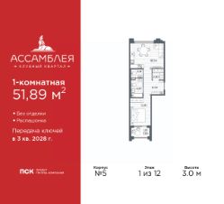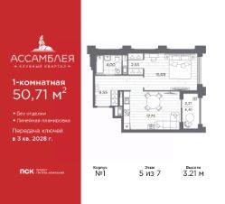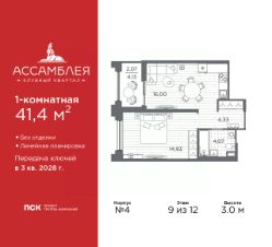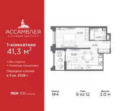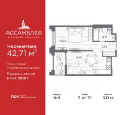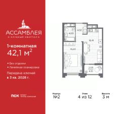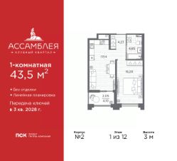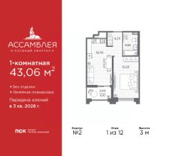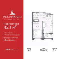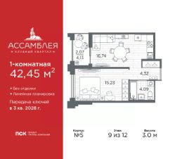 Однокомнатная квартира в Клубный квартал ''Ассамблея'' на 9 этаже. Квартира без отделки, после выдачи ключей можно делать ремонт. Общая площадь: 42.45 кв.м., жилая: 15.23 кв.м., площадь просторной кухни-столовой: 16.74 кв.м. Все окна выходят на одну сторону. В квартире одна лоджия, один совмещенный санузел. Высота потолков 3.0 м. Дом монолитный, черырехподъездный, высотой 12 этажей. Квартира находится в 1-й секции в корпусе 5. На этаже 6 квартир. В подъезде 1 пассажирский и 1 грузовой лифт. Окончание строительства - 3 квартал 2028 года. Оформление сделки по договору долевого участия. В шаговой доступности от жилого комплекса расположены станции метро (расстояние по прямой): ''Горный институт'' (1.0 км), ''Василеостровская'' (1.4 км), ''Приморская'' (1.5 км), также недалеко от этого корпуса находятся станции метро: ''Спортивная'', ''Чкаловская''. ''Клубный квартал Ассамблея'' — проект бизнес-класса на Васильевском острове, в самом сердце исторического Петербурга. Комплекс состоит из пяти корпусов переменной этажности — от 7 до 12 этажей — с выразительной архитектурой в стиле неомодернизма: светлый клинкер, панорамное остекление, просторное лобби с потолками высотой почти 8 метров. Потолки — до 3,2 метров. Подземный паркинг на 667 машиномест. Комфорт и инфраструктура Проект ориентирован на комфортную городскую жизнь. В закрытом дворе — ландшафтное озеленение, современные детские и спортивные площадки. Внутренний клуб для резидентов включает коворкинг, переговорные, кинозал, фитнес и бьюти-зону. IP-домофония с просмотром камер видеонаблюдения, дистанционное открывание дверей и доступа на территорию и в парадную со смартфона и планшета, просмотр показаний счетчиков, приложение для жителей PSK Home. Локация Расположение на Васильевском острове — сильная сторона проекта. До четырех станций метро (''Горный институт'', ''Василеостровская'', ''Спортивная'', ''Приморская'') — 515 минут пешком. В шаговой доступности — зелёные зоны, культурные учреждения, в том числе сад ''Василеостровец'' и ДК имени Кирова. Основные магистрали Большой, Средний и Малый проспекты, Наличная и Уральская улицы. Съезд на ЗСД расположен недалеко от станции метро ''Приморская'', близ береговой линии. Благовещенский и Дворцовый мосты соединяют остров с центром города, а мосты Тучков, Биржевой и Бетанкура — с Петроградской стороной. Застройщик Группа компаний ПСК является одной из ведущих девелоперских компаний Санкт Петербурга. На протяжении 18 лет она возводит в Северной столице качественное жилье премиум, бизнес и комфорт-класса, социальные объекты школы и детские сады, апарт-отели и торговые центры. Является шестикратным обладателем золотого знака ''Надежный застройщик России''. #ZmBgtf