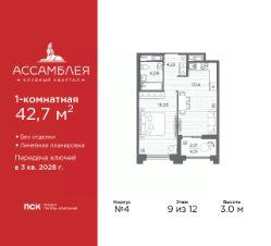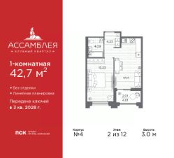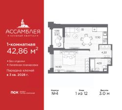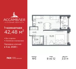 1-комн. квартира в Клубный квартал ''Ассамблея'' на 9 этаже. Квартира без отделки, после получения ключей можно делать ремонт. Общая площадь: 41.3 кв.м., жилая: 14.93 кв.м., площадь просторной кухни-столовой: 15.9 кв.м. Все окна выходят на одну сторону. В квартире одна лоджия, один совмещенный санузел. Высота потолков 3.0 м. Дом монолитный, трехподъездный, высотой 12 этажей. Квартира находится в 3-й секции в корпусе 4. На этаже 9 квартир. В подъезде 1 пассажирский и 1 грузовой лифт. Начало строительства - 3 квартал 2025 года. Окончание строительства - 3 квартал 2028 года. Оформление сделки по договору долевого участия. В шаговой доступности от жилого комплекса имеются станции метро (расстояние по прямой): ''Горный институт'' (1.0 км), ''Василеостровская'' (1.4 км), ''Приморская'' (1.5 км), также недалеко от этого корпуса находятся станции метро: ''Спортивная'', ''Чкаловская''. ''Клубный квартал Ассамблея'' — проект бизнес-класса на Васильевском острове, в самом сердце исторического Петербурга. Комплекс состоит из пяти корпусов переменной этажности — от 7 до 12 этажей — с выразительной архитектурой в стиле неомодернизма: светлый клинкер, панорамное остекление, просторное лобби с потолками высотой почти 8 метров. Потолки — до 3,2 метров. Подземный паркинг на 667 машиномест. Комфорт и инфраструктура Проект ориентирован на комфортную городскую жизнь. В закрытом дворе — ландшафтное озеленение, современные детские и спортивные площадки. Внутренний клуб для резидентов включает коворкинг, переговорные, кинозал, фитнес и бьюти-зону. IP-домофония с просмотром камер видеонаблюдения, дистанционное открывание дверей и доступа на территорию и в парадную со смартфона и планшета, просмотр показаний счетчиков, приложение для жителей PSK Home. Локация Расположение на Васильевском острове — сильная сторона проекта. До четырех станций метро (''Горный институт'', ''Василеостровская'', ''Спортивная'', ''Приморская'') — 515 минут пешком. В шаговой доступности — зелёные зоны, культурные учреждения, в том числе сад ''Василеостровец'' и ДК имени Кирова. Основные магистрали Большой, Средний и Малый проспекты, Наличная и Уральская улицы. Съезд на ЗСД расположен недалеко от станции метро ''Приморская'', близ береговой линии. Благовещенский и Дворцовый мосты соединяют остров с центром города, а мосты Тучков, Биржевой и Бетанкура — с Петроградской стороной. Застройщик Группа компаний ПСК является одной из ведущих девелоперских компаний Санкт Петербурга. На протяжении 18 лет она возводит в Северной столице качественное жилье премиум, бизнес и комфорт-класса, социальные объекты школы и детские сады, апарт-отели и торговые центры. Является шестикратным обладателем золотого знака ''Надежный застройщик России''. #z6BgsA