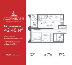 1-комн. квартира-студия в Клубный квартал ''Ассамблея'' на 9 этаже. Квартира без отделки, новый владелец может сделать ремонт по своему дизайн-проекту. Общая площадь: 29.29 кв.м., площадь гостиной 19.43 кв.м., из которых 5 кв.м. выделено под кухонную зону. Все окна выходят на одну сторону. В квартире один балкон, один совмещенный санузел. Высота потолков 3 м. Дом монолитный, двухподъездный, высотой 12 этажей. Квартира находится во 2-й секции в корпусе 3. На этаже 6 квартир. В подъезде 1 пассажирский и 1 грузовой лифт. Начало строительства - 2 квартал 2025 года. Окончание строительства - 3 квартал 2028 года. Оформление сделки по договору долевого участия. В шаговой доступности от жилого комплекса находятся станции метро (расстояние по прямой): ''Горный институт'' (1.0 км), ''Василеостровская'' (1.4 км), ''Приморская'' (1.5 км), также недалеко от этого корпуса находятся станции метро: ''Спортивная'', ''Чкаловская''. ''Клубный квартал Ассамблея'' — проект бизнес-класса на Васильевском острове, в самом сердце исторического Петербурга. Комплекс состоит из пяти корпусов переменной этажности — от 7 до 12 этажей — с выразительной архитектурой в стиле неомодернизма: светлый клинкер, панорамное остекление, просторное лобби с потолками высотой почти 8 метров. Потолки — до 3,2 метров. Подземный паркинг на 667 машиномест. Комфорт и инфраструктура Проект ориентирован на комфортную городскую жизнь. В закрытом дворе — ландшафтное озеленение, современные детские и спортивные площадки. Внутренний клуб для резидентов включает коворкинг, переговорные, кинозал, фитнес и бьюти-зону. IP-домофония с просмотром камер видеонаблюдения, дистанционное открывание дверей и доступа на территорию и в парадную со смартфона и планшета, просмотр показаний счетчиков, приложение для жителей PSK Home. Локация Расположение на Васильевском острове — сильная сторона проекта. До четырех станций метро (''Горный институт'', ''Василеостровская'', ''Спортивная'', ''Приморская'') — 515 минут пешком. В шаговой доступности — зелёные зоны, культурные учреждения, в том числе сад ''Василеостровец'' и ДК имени Кирова. Основные магистрали Большой, Средний и Малый проспекты, Наличная и Уральская улицы. Съезд на ЗСД расположен недалеко от станции метро ''Приморская'', близ береговой линии. Благовещенский и Дворцовый мосты соединяют остров с центром города, а мосты Тучков, Биржевой и Бетанкура — с Петроградской стороной. Застройщик Группа компаний ПСК является одной из ведущих девелоперских компаний Санкт Петербурга. На протяжении 18 лет она возводит в Северной столице качественное жилье премиум, бизнес и комфорт-класса, социальные объекты школы и детские сады, апарт-отели и торговые центры. Является шестикратным обладателем золотого знака ''Надежный застройщик России''. #2mBVEW