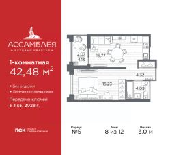 Продается однокомнатная квартира в Клубный квартал ''Ассамблея'' на 9 этаже. Квартира без отделки, после получения ключей можно делать ремонт. Общая площадь: 42.48 кв.м., жилая: 15.23 кв.м., площадь просторной кухни-столовой: 16.77 кв.м. Все окна выходят на одну сторону. В квартире одна лоджия, один совмещенный санузел. Высота потолков 3.0 м. Дом монолитный, черырехподъездный, высотой 12 этажей. Квартира находится в 4-й секции в корпусе 5. На этаже 10 квартир. В подъезде 1 пассажирский и 1 грузовой лифт. Окончание строительства - 3 квартал 2028 года. Оформление сделки по договору долевого участия. В шаговой доступности от жилого комплекса находятся станции метро (расстояние по прямой): ''Горный институт'' (1.0 км), ''Василеостровская'' (1.4 км), ''Приморская'' (1.5 км), также недалеко от этого корпуса находятся станции метро: ''Спортивная'', ''Чкаловская''. ''Клубный квартал Ассамблея'' — проект бизнес-класса на Васильевском острове, в самом сердце исторического Петербурга. Комплекс состоит из пяти корпусов переменной этажности — от 7 до 12 этажей — с выразительной архитектурой в стиле неомодернизма: светлый клинкер, панорамное остекление, просторное лобби с потолками высотой почти 8 метров. Потолки — до 3,2 метров. Подземный паркинг на 667 машиномест. Комфорт и инфраструктура Проект ориентирован на комфортную городскую жизнь. В закрытом дворе — ландшафтное озеленение, современные детские и спортивные площадки. Внутренний клуб для резидентов включает коворкинг, переговорные, кинозал, фитнес и бьюти-зону. IP-домофония с просмотром камер видеонаблюдения, дистанционное открывание дверей и доступа на территорию и в парадную со смартфона и планшета, просмотр показаний счетчиков, приложение для жителей PSK Home. Локация Расположение на Васильевском острове — сильная сторона проекта. До четырех станций метро (''Горный институт'', ''Василеостровская'', ''Спортивная'', ''Приморская'') — 515 минут пешком. В шаговой доступности — зелёные зоны, культурные учреждения, в том числе сад ''Василеостровец'' и ДК имени Кирова. Основные магистрали Большой, Средний и Малый проспекты, Наличная и Уральская улицы. Съезд на ЗСД расположен недалеко от станции метро ''Приморская'', близ береговой линии. Благовещенский и Дворцовый мосты соединяют остров с центром города, а мосты Тучков, Биржевой и Бетанкура — с Петроградской стороной. Застройщик Группа компаний ПСК является одной из ведущих девелоперских компаний Санкт Петербурга. На протяжении 18 лет она возводит в Северной столице качественное жилье премиум, бизнес и комфорт-класса, социальные объекты школы и детские сады, апарт-отели и торговые центры. Является шестикратным обладателем золотого знака ''Надежный застройщик России''. #Zm2AUm