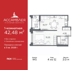 Просторная 1-комн. квартира в Клубный квартал ''Ассамблея'' на 4 этаже. Квартира без отделки, после выдачи ключей можно делать ремонт. Общая площадь: 42.48 кв.м., жилая: 15.23 кв.м., площадь просторной кухни-столовой: 16.77 кв.м. Все окна выходят на одну сторону. В квартире одна лоджия, один совмещенный санузел. Высота потолков 3.0 м. Дом монолитный, черырехподъездный, высотой 12 этажей. Квартира находится во 2-й секции в корпусе 5. На этаже 8 квартир. В подъезде 1 пассажирский и 1 грузовой лифт. Окончание строительства - 3 квартал 2028 года. Оформление сделки по договору долевого участия. В шаговой доступности от жилого комплекса находятся станции метро (расстояние по прямой): ''Горный институт'' (1.0 км), ''Василеостровская'' (1.4 км), ''Приморская'' (1.5 км), также недалеко от этого корпуса находятся станции метро: ''Спортивная'', ''Чкаловская''. ''Клубный квартал Ассамблея'' — проект бизнес-класса на Васильевском острове, в самом сердце исторического Петербурга. Комплекс состоит из пяти корпусов переменной этажности — от 7 до 12 этажей — с выразительной архитектурой в стиле неомодернизма: светлый клинкер, панорамное остекление, просторное лобби с потолками высотой почти 8 метров. Потолки — до 3,2 метров. Подземный паркинг на 667 машиномест. Комфорт и инфраструктура Проект ориентирован на комфортную городскую жизнь. В закрытом дворе — ландшафтное озеленение, современные детские и спортивные площадки. Внутренний клуб для резидентов включает коворкинг, переговорные, кинозал, фитнес и бьюти-зону. IP-домофония с просмотром камер видеонаблюдения, дистанционное открывание дверей и доступа на территорию и в парадную со смартфона и планшета, просмотр показаний счетчиков, приложение для жителей PSK Home. Локация Расположение на Васильевском острове — сильная сторона проекта. До четырех станций метро (''Горный институт'', ''Василеостровская'', ''Спортивная'', ''Приморская'') — 515 минут пешком. В шаговой доступности — зелёные зоны, культурные учреждения, в том числе сад ''Василеостровец'' и ДК имени Кирова. Основные магистрали Большой, Средний и Малый проспекты, Наличная и Уральская улицы. Съезд на ЗСД расположен недалеко от станции метро ''Приморская'', близ береговой линии. Благовещенский и Дворцовый мосты соединяют остров с центром города, а мосты Тучков, Биржевой и Бетанкура — с Петроградской стороной. Застройщик Группа компаний ПСК является одной из ведущих девелоперских компаний Санкт Петербурга. На протяжении 18 лет она возводит в Северной столице качественное жилье премиум, бизнес и комфорт-класса, социальные объекты школы и детские сады, апарт-отели и торговые центры. Является шестикратным обладателем золотого знака ''Надежный застройщик России''. #zMZ9Ae