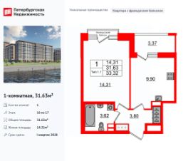 Продается уютная 1-комнатная квартира от застройщика в жилом комплексе ''Setl Ривьера'' в активно развивающимся Невском районе.До метро можно добраться на транспорте всего за 10 минут.Французский балкон придает особенный европейский шик комнате.Уникальная планировка, кухня 9.9 м², вместительная прихожая 3.8 м². Общая площадь квартиры - 31.63 м², жилая 14.31 м², высота потолка 2.77 м.Квартира продается с отделкой ''Норд Лайн серый плюс''.Что особенного в ЖК ''Setl Ривьера''?• Первая береговая линия Невы. 5 км до центра Петербурга• ''Активити парк'' - пространство для занятий спортом и отдыха. ''Ривьера парк'' с променадом и панорамной ротондой• Масштабные дворы 10 000 кв.м. с авторским ландшафтным дизайном• Двухуровневые единые входные группы• Видовые квартиры с террасами, каминами и саунами