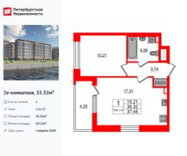 Продается просторная 1-комнатная квартира от застройщика в жилом комплексе ''Setl Ривьера'' в активно развивающимся Невском районе.До метро можно добраться на транспорте всего за 10 минут.Удобная, классическая, функциональная европланировка, большая кухня-гостиная 17.31 м², вместительная прихожая 3.74 м². Общая площадь квартиры - 35.32 м², жилая 10.21 м², высота потолка 2.77 м.Квартира продается с отделкой ''NORD LINE SILVER ВК NEW''.Что особенного в ЖК ''Setl Ривьера''?• Первая береговая линия Невы. 5 км до центра Петербурга• ''Активити парк'' - пространство для занятий спортом и отдыха. ''Ривьера парк'' с променадом и панорамной ротондой• Масштабные дворы 10 000 кв.м. с авторским ландшафтным дизайном• Двухуровневые единые входные группы• Видовые квартиры с террасами, каминами и саунами