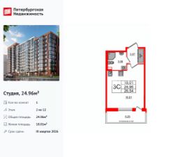 Продается просторная студия от застройщика в жилом комплексе ''Титул в Московском'' в престижном Московском районе.До метро можно добраться пешком всего за 25 минут.Удобная, классическая, функциональная европланировка, вместительная прихожая 3.07 м². Общая площадь студии - 24.96 м², жилая 18.01 м², высота потолка 2.77 м.Квартира продается с отделкой ''Норд Лайн серый плюс''.Что особенного в ЖК ''Титул в Московском''?• Престижный Московский район• Авторская архитектурная концепция• 2 центральные входные группы с ресепшн и лаундж-зонами• Кленовая аллея с арт-стеллой, цветочная аллея и сад трав• Уютные дворы-патио, площадки SetlKids и SetlSport• Инновационный Лицей Setl с оригинальной архитектурной концепцией и уникальной образовательной средой