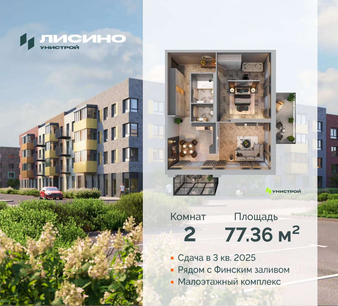 Лисино ''Лисино'' город-парк в Курортном районе Санкт-Петербурга от компании ''Унистрой''. Рядом Финский залив, экопарк, озеро, а также самый высокий небоскреб в Европе. Комплекс отличает чистый воздух, малоэтажная застройка, фасады из клинкерной плитки, уютные дворы, прогулочный бульвар, парковые зоны. Представлено разнообразие планировок: от студий, до двухуровневых квартир. Живите там, где другие отдыхают Город-парк ''Лисино'' находится в Курортном районе Санкт-Петербурга, в 15 минутах езды по Приморскому шоссе от станции метро ''Беговая''. Рядом Финский залив с благоустроенным пляжем, экопарк, озеро Сестрорецкий разлив и ''Лахта Центр''. Локация славится морским воздухом и хвойными лесами. Вблизи расположены Сестрорецкие болота, известные минеральной водой и лечебными грязями. Живите там, где комфортная застройка Комплекс состоит из малоэтажных домов квартальной застройки, создающих приватные дворы без машин. Высота в 4 этажа обеспечивает уют и простор. Урбан-виллы с террасами отделены приватными садами и прогулочными зонами. Фасады из клинкерной плитки натуральных оттенков подчеркивают природное окружение. Дома расположены таким образом, чтобы из квартир открывались виды на лесопарк или сад. Живите там, где много парков Территория выполнена в виде сенсорных садов, отражающих времена года с соответствующей растительностью. В центре расположен парк с различными зонами: центральная площадь, пруд с набережной, игровые площадки для детей, йога-парки, экотропа, спортивный хаб, скейтпарк, памптрек, велодорожки. Живите там, где стильно Двор и входы в парадные без пандусов и ступеней. Входные группы и холлы оформлены в натуральных оттенках по авторскому дизайн-проекту, и включают домофоны в тёплых тамбурах, бесшумные лифты и колясочные. Жилые этажи выдержаны в едином стиле. На цокольных этажах есть индивидуальные кладовые. Живите там, где красивые виды В ''Лисино'' представлены разнообразные планировочные решения: студии, евроформаты, квартиры с саунами, мастер-спальнями, угловыми окнами, постирочными. На первых этажах расположены квартиры с террасами. Доступны двухуровневые квартиры и урбан-виллы, а также квартиры с тёплыми лоджиями. Живите там, где высокий сервис В квартирах предусмотрена предчистовая отделка с качественными материалами: металлические входные двери со smart-замками, улучшенная теплоизоляция, окна с энергоэффективными стеклопакетами, стяжка пола, скрытая разводка коммуникаций, радиаторы с терморегуляцией. Входы в парадные оснащены домофонами с бесконтактным доступом и распознаванием лиц. Питьевая вода будет подаваться в каждую квартиру. Автоматизирован учет потребления ресурсов. Живите там, где всё рядом В ''Лисино'' будут 2 школы и 4 детских сада, а также поликлиника, многофункциональный центр, физкультурно-оздоровительный комплекс и культурный центр. На первых этажах откроются коммерческие помещения. Комплекс будет оснащен многоуровневым паркингом, автостоянкой, станциями для заряда электромобилей, велопарковками и местами для выгула живот