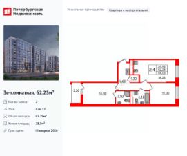 Продается просторная 2-комнатная квартира от застройщика в жилом комплексе ''Бионика Заповедная'' в динамичном Приморском районе.До метро можно добраться на транспорте всего за 11 минут.Мастер-спальня с собственной ванной комнатой. Самое приватное пространство в вашей квартире.Уникальная, функциональная европланировка, большая кухня-гостиная 18.2 м², просторная прихожая 9.65 м². Общая площадь квартиры - 62.25 м², жилая 25.5 м², высота потолка 2.77 м.Квартира продается с отделкой ''NORD LINE SILVER ВК NEW''.Что особенного в ЖК ''Бионика Заповедная''?• Оазис в городе 3 минуты пешком до Новоорловского заказника (140 ГА)• Захватывающие виды из окон на хвойный лесопарк• Всесезонный ''Заповедный парк'' во дворе площадью 23000 кв.м.• 5 единых входных групп с авторским дизайном и лаундж-зонами, сити-виллы на первых этажах с палисадниками и высотой потолков до 4 м• Места притяжения: фонтан ''Бионика'', спортивный кластер со скейт-парком, фотозоны с арт-объектами