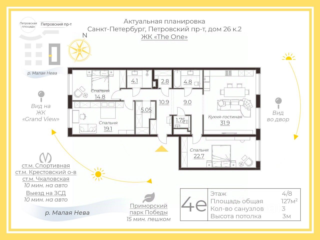 Арт. 131188992 Квартира с тремя спальнями, новым ремонтом и продуманной, до мелочей, планировкой в технологичном доме The One. Идеальный вариант для большой семьи! О квартире: Квартира расположена на четвертом этаже. Благодаря увеличенным оконным проемам и ориентации на восток и запад, в квартире всегда будет много естественного света и солнечных лучей. В конце 2025 года был завершен ремонт по дизайн-проекту. Планировка включает в себя кухню-гостиную (31,9м²), 3 спальни (22,7м², 19,1м² и 14,8м²), 3 санузла, а также гардеробную и постирочную комнаты. Большое количество мест для хранения. Ремонт собственники делали для собственного проживания. О комплексе: Жилой комплекс The One от застройщика Setl Group был построен в 2022 году. Просторный внутренний двор с современными детскими площадками, зона отдыха с беседками и лежаками для приема солнечных ванн, а также собственный выход к набережной Малой Невы, где будет приятно гулять в любое время года. И важная деталь, из-за которой многие выбирают именно The One: дом расположен на отдалении от Петровского проспекта, а также в доме отсутствуют коммерческие помещения. В сочетании с закрытой территорией и круглосуточной службой консьержей это гарантирует безопасность и полную приватность для жителей. О локации: Петровская коса - это место, окруженное зеленью и водой. Всего в 5 минутах на автомобиле один из лучших парков города - Приморский парк Победы. Петроградская сторона, Центральный район, заезд на ЗСД, весь деловой и культурный центр - все это в 5-10 минутах от Вас. О документах: Прямая продажа. Один взрослый собственник. Готовы к быстрому выходу на сделку! Звоните и приходите на просмотр!