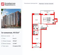 Продаётся 2-комн. квартира площадью 53 кв.м на 5 этаже 12 этажного дома (Корпус 6, Секция 2) проекта ПИК Витебский парк. Светлый просторный подъезд на уровне земли, функциональная планировка, большие окна, предчистовая отделка. Жилой квартал ''Витебский парк'' находится во Фрунзенском районе Санкт-Петербурга, в 15 минутах пешком от метро ''Обводный канал''. А в 2027 году всего в паре минут от проекта планируют открыть станцию метро ''Боровая''. В квартал входят 3 детских сада, школа и 7 жилых домов с дворами-парками, куда не могут зайти посторонние люди и заехать автомобили. Школа на 1250 мест и детский сад на 350 мест откроются одновременно с заселением первой очереди, это значит, что жители проекта смогут отдать своих детей в новые образовательные учреждения на территории квартала. Во дворах приятно отдыхать, знакомиться с соседями и даже заниматься йогой, а для детей мы построим детские площадки. Рядом появятся современные спортивные площадки. На первых этажах домов откроются магазины, кафе и другие сервисы. Через весь жилой район протянется широкий пешеходный бульвар для прогулок и спорта. Рядом с ''Витебским парком'' есть всё для комфортной жизни: магазины, торговые центры, фитнес-клубы, кафе и рестораны, а ещё детские сады, школы, вузы и поликлиника. Артикул 1005253 (Застройщик ООО ''СЗ ''Лиговский Сити'') [cn_sbp_1838851]