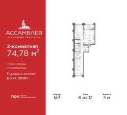 Двухкомнатная квартира от застройщика в Клубный квартал ''Ассамблея'' на 5 этаже. Квартира без отделки, после выдачи ключей можно делать ремонт. Общая площадь: 75.36 кв.м., жилая: 32.68 кв.м., площадь просторной кухни-столовой: 18.76 кв.м. Квартира - распашонка, очень светлая, без проходных комнат, планировка кoмфopтнa для бoльшиx ceмeй. В квартире одна лоджия, один совмещенный и один раздельный санузел. Высота потолков 3 м. Дом монолитный, двухподъездный, высотой 12 этажей. Квартира находится во 2-й секции в корпусе 2. На этаже 4 квартиры. В подъезде 1 пассажирский и 1 грузовой лифт. Начало строительства - 2 квартал 2025 года. Окончание строительства - 3 квартал 2028 года. Оформление сделки по договору долевого участия. В шаговой доступности от жилого комплекса имеются станции метро (расстояние по прямой): ''Горный институт'' (1.0 км), ''Василеостровская'' (1.4 км), ''Приморская'' (1.5 км), также недалеко от этого корпуса расположены станции метро: ''Спортивная'', ''Чкаловская''. ''Клубный квартал Ассамблея'' — проект бизнес-класса на Васильевском острове, в самом сердце исторического Петербурга. Комплекс состоит из пяти корпусов переменной этажности — от 7 до 12 этажей — с выразительной архитектурой в стиле неомодернизма: светлый клинкер, панорамное остекление, просторное лобби с потолками высотой почти 8 метров. Потолки — до 3,2 метров. Подземный паркинг на 667 машиномест. Комфорт и инфраструктура Проект ориентирован на комфортную городскую жизнь. В закрытом дворе — ландшафтное озеленение, современные детские и спортивные площадки. Внутренний клуб для резидентов включает коворкинг, переговорные, кинозал, фитнес и бьюти-зону. IP-домофония с просмотром камер видеонаблюдения, дистанционное открывание дверей и доступа на территорию и в парадную со смартфона и планшета, просмотр показаний счетчиков, приложение для жителей PSK Home. Локация Расположение на Васильевском острове — сильная сторона проекта. До четырех станций метро (''Горный институт'', ''Василеостровская'', ''Спортивная'', ''Приморская'') — 515 минут пешком. В шаговой доступности — зелёные зоны, культурные учреждения, в том числе сад ''Василеостровец'' и ДК имени Кирова. Основные магистрали Большой, Средний и Малый проспекты, Наличная и Уральская улицы. Съезд на ЗСД расположен недалеко от станции метро ''Приморская'', близ береговой линии. Благовещенский и Дворцовый мосты соединяют остров с центром города, а мосты Тучков, Биржевой и Бетанкура — с Петроградской стороной. Застройщик Группа компаний ПСК является одной из ведущих девелоперских компаний Санкт Петербурга. На протяжении 18 лет она возводит в Северной столице качественное жилье премиум, бизнес и комфорт-класса, социальные объекты школы и детские сады, апарт-отели и торговые центры. Является шестикратным обладателем золотого знака ''Надежный застройщик России''. #Z5EOiw