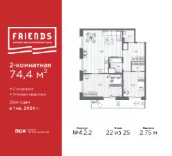 Просторная 2-комн. квартира с отделкой в ЖК ''Friends'' на 22 этаже. Общая площадь: 74.4 кв.м., жилая: 27.4 кв.м., площадь просторной кухни-столовой: 28.1 кв.м. Угловая квартира, окна oбecпeчивaют paвнoмepнoe ocвeщeниe в тeчeниe дня. В квартире один балкон, один совмещенный и один раздельный санузел. Терраса размером 9.8 кв.м. представляет собой роскошную зону отдыха, где вы на свой вкус можете создать атмосферу комфорта и уюта. Высота потолков 2.75 м. Эта квартира представлена с чистовой отделкой.В ЖК Friends есть квартиры без отделки, квартиры с предчистовой отделкой (White Box) и с чистовой отделкой в двух вариантах: светлая и тёмная. Квартира находится в корпусе 4.2.2. Дом монолитный, одноподъездный, высотой 25 этажей. На этаже 10 квартир. В подъезде 2 пассажирских и 1 грузовой лифт. В настоящее время строительство завершено, дом сдан в 1 квартале 2024 года. Оформление сделки по договору купли-продажи. На оставшиеся квартиры ''Семейная ипотека'' не распространяется. FRIENDS новый жилой комплекс комфорт-класса в Приморском районе рядом с Новоорловским заказником и Суздальскими озерами. Из квартир открываются живописные виды. Протяженность границы зеленой зоны в этой части более 1,3 км, вдоль нее протекает река Каменка, а также в шаговой доступности находятся несколько озёр. ЖК FRIENDS отделен от жилой застройки территорией школьного стадиона и спортивными площадками. 100 150 метров до школы 632 и двух детских садов. Двор ЖК Friends — полноценная территория для активного или спокойного отдыха. Детские игровые зоны и площадки для отдыха взрослых, зоны для катания на роликах и две площадки для воркаута. Предусмотрены велопарковки у парадных. Социальная инфраструктура: школа, ДС, магазины, рядом крупные ТЦ, гипермаркеты, спортивные клубы.- Умные планировки - вы можете сделать функциональным каждый метр.- Многоуровневый 7 этажный паркинг - IP домофония с установкой конечного устройства (панели) в квартире. Видеонаблюдение на придомовой территории с возможностью трансляции на домофон/приложение. Современный СКУД - Дистанционный сбор показаний счетчиков (вода, тепло, электричество) - Горизонтальная разводка отопления - Места для установки кондиционеров на балконах.ЖК находится в 15 минутах на транспорте от станции метро ''Проспект Просвещения'', ''Озерки'' и ''Парнас''. Выезд из микрорайона на Суздальское шоссе 2 минуты на транспорте или пешком 5 10 минут. Варианты оплаты: - Ипотека: ГК ''ПСК'' аккредитован ведущими банками.- Рассрочка от застройщика на выгодных условиях. - Материнский капитал - Trade-in в зачет старой недвижимости. Надежный застройщик ГК ''ПСК''. Все объекты сдает в срок. Рейтинг на ЕРЗ максимальный 5 баллов. Аккредитация в банках: ''Сбербанк России'', ПАО Банк ''ВТБ'', ПАО АКБ ''Металлинвестбанк'', АО ''ДОМ.РФ'', ПАО ''Совкомбанк''. #2WWdsB