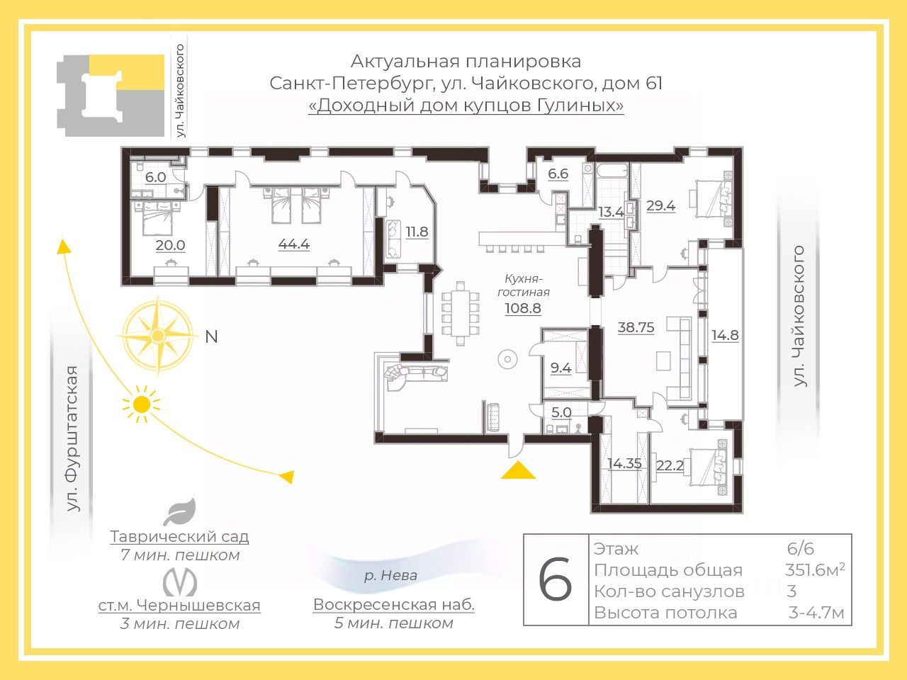 Арт. 129335598 Продается новый пентхаус с террасой и панорамными видами в отреставрированном историческом здании в самом сердце Петербурга. О доме: -Фешенебельное здание, доходный дом купцов Гулиных - своеобразный памятник этой известной семье, члены которой построили несколько десятков зданий в Санкт-Петербурге. Объект культурного наследия, памятник архитектуры. -Фасаду здания в 2025 году вернули его историческое великолепие, работы велись в течение 3 лет: выполнены работы по реставрации кирпичной кладки, восстановлен архитектурный лепной декор, по архивным данным воссоздано ограждение балкона и деревянные входные группы, отреставрированы аутентичные элементы фасада- керамический кабанчик и исторические ворота, козырьки, оконные решетки. -Парадный вход с ул. Чайковского. -Исторический парадный вестибюль с лепным и штукатурным декором, метлахской плиткой, люстрами, высокими арочными окнами, массивными дубовыми дверями. -Широкая ажурная парадная лестница с кованным ограждением и дубовыми перилами. -Лифт. -На первом этаже-Галерея современного искусства. О квартире: -НОВЫЙ, ПОЛНОСТЬЮ ЗАВЕРШЕННЫЙ ДИЗАЙНЕРСКИЙ РЕМОНТ. Новая электрика, теплые полы, все коммуникации. Увеличенная мощность электричества, отдельные стояки для подачи воды, современная система вентиляции и кондиционирования. -ПАНОРАМНЫЕ ВИДЫ на исторические доминанты Санкт-Петербурга, ул. Чайковского, пр. Чернышевского и во внутренний двор. -В квартире 22 окна. -Общая площадь квартиры 351,6 м² + открытая терраса 14,8 м². -ВЫСОТА ПОТОЛКОВ от 3 до 4,7 м. -ПОЛНАЯ МЕБЛИРОВКА И ОТДЕЛКА дорогой европейской мебелью и техникой, премиальными материалами. Планировка: Визуально квартира делится на три части: - Центральная, широкая часть с высокими потолками и большим количеством окон выходит на пр. Чернышевского, в ней расположены: холл, кухня- столовая с каменным островом и обеденным столом длиной 3,2 метра, просторная гостиная, постирочная, гостевой санузел при входе, гардеробная для верхних вещей. - Правая часть квартиры выходит на ул. Чайковского, в ней располагаются: большая гостиная с выходом на террасу, две спальни, в одной из которых имеется отдельная гардеробная комната. - В левой части квартиры расположены три спальни с высокими потолками и видом во внутренний двор, санузел, коридор с естественным светом от 5 больших окон с видом на пр. Чернышевского. -Дизайнерские изюминки: декоративная скала с подсветкой, каменные столешницы, эксклюзивная мебель и предметы интерьера. -На этаже всего две квартиры. О месте: -Таврический сад, станция метро ''Чернышевская'', Воскресенская набережная, р.Нева в пешей доступности. Документы: -Один взрослый собственник. Чистая сделка. Кому подойдет: Ценителям и коллекционерам уникальной архитектуры, безупречного стиля и полностью готовых решений в лучшей локации Санкт-Петербурга. Приглашаем на просмотр. Звоните!