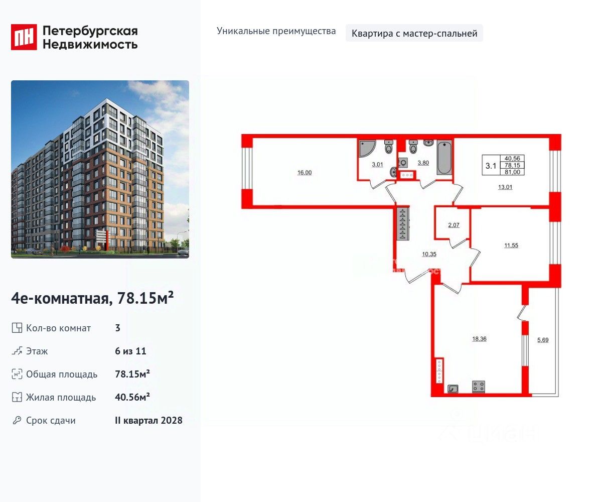 Продается уютная, семейная 3-комнатная квартира от застройщика в жилом комплексе ''Астра Континенталь'' в активно развивающимся Невском районе. До метро можно добраться пешком всего за 5 минут. Мастер-спальня с собственной ванной комнатой. Самое приватное пространство в вашей квартире. Уникальная, функциональная европланировка, большая кухня-гостиная 18.36 м², вместительная прихожая 10.35 м². Общая площадь квартиры - 78.15 м², жилая 40.56 м², высота потолка 2.77 м. Квартира продается с отделкой ''Норд Лайн серый плюс''. Что особенного в ЖК ''Астра Континенталь''? • Уникальная локация 400 метров до метро, 300 метров до благоустроенной набережной • Самодостаточный квартал со всей инфраструктурой в 3-х км от центра • Впечатляющий объем благоустройства: 30 000 кв. метров рекреационных зон с променадом и гейзерными фонтанами • Масштабный парк ''Город Спорта''