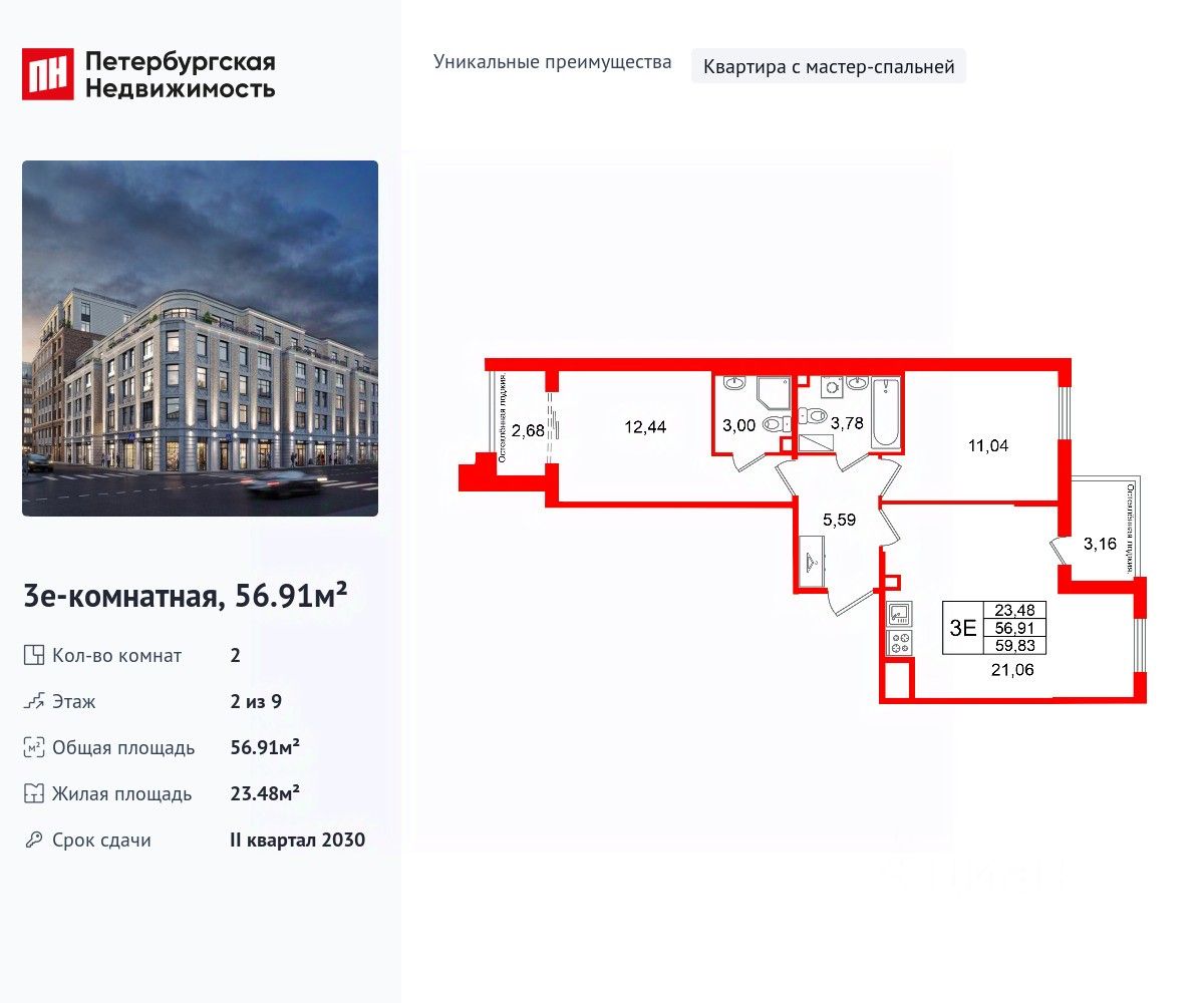 Продается уютная 2-комнатная квартира от застройщика в жилом комплексе ''Кристалл Холл'' в Адмиралтейском районе. До метро можно добраться Тип 1 всего за 15 минут. Мастер-спальня с собственной ванной комнатой. Самое приватное пространство в вашей квартире. Уникальная, функциональная европланировка, большая кухня-гостиная 21.06 м², вместительная прихожая 5.59 м². Общая площадь квартиры - 56.91 м², жилая 23.48 м², высота потолка 3 м. Квартира продается с отделкой ''Норд Лайн бизнес''. Что особенного в ЖК ''Кристалл Холл''? • 300 м. до наб. Фонтанки, в двух шагах от Троицкого собора и Юсуповского дворца. • Сочетание стилей модерн и эклектика, дополненных элементами классического петербургского стиля. • Клубный дом премиум-класса - всего 236 квартир. • Парадное лобби с потолком до 6,5 м и лаунж-зоной с камином. • Камерный сад, зеленая гостиная, фонтан. • Клуб резидентов: кинотеатр, бильярдная комната, переговорная, детский клуб, фитнес-зал с комнатой для йоги. • Потолки от 3 м до 3,45 м. • Премиальная отделка квартир - Норд Лайн бизнес