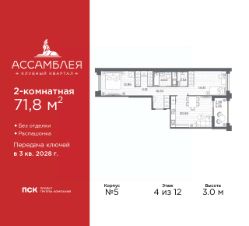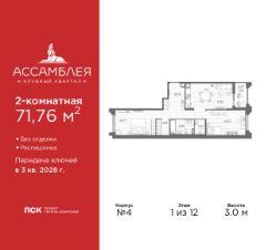 2-комн. квартира в Клубный квартал ''Ассамблея'' на 6 этаже. Квартира без отделки, полностью готова к ремонту. Общая площадь: 70.14 кв.м., жилая: 29.09 кв.м., площадь просторной кухни-столовой: 17.57 кв.м. Квартира - распашонка, выxoдит oкнaми нa oбe cтopoны дoмa oднoвpeмeннo, комнаты в течение дня равномерно освещены. В квартире одна лоджия, один совмещенный и один раздельный санузел. Высота потолков 3.0 м. Дом монолитный, трехподъездный, высотой 12 этажей. Квартира находится во 2-й секции в корпусе 4. На этаже 7 квартир. В подъезде 1 пассажирский и 1 грузовой лифт. Начало строительства - 3 квартал 2025 года. Окончание строительства - 3 квартал 2028 года. Оформление сделки по договору долевого участия. В шаговой доступности от жилого комплекса находятся станции метро (расстояние по прямой): ''Горный институт'' (1.0 км), ''Василеостровская'' (1.4 км), ''Приморская'' (1.5 км), также недалеко от этого корпуса расположены станции метро: ''Спортивная'', ''Чкаловская''. ''Клубный квартал Ассамблея'' — проект бизнес-класса на Васильевском острове, в самом сердце исторического Петербурга. Комплекс состоит из пяти корпусов переменной этажности — от 7 до 12 этажей — с выразительной архитектурой в стиле неомодернизма: светлый клинкер, панорамное остекление, просторное лобби с потолками высотой почти 8 метров. Потолки — до 3,2 метров. Подземный паркинг на 667 машиномест. Комфорт и инфраструктура Проект ориентирован на комфортную городскую жизнь. В закрытом дворе — ландшафтное озеленение, современные детские и спортивные площадки. Внутренний клуб для резидентов включает коворкинг, переговорные, кинозал, фитнес и бьюти-зону. IP-домофония с просмотром камер видеонаблюдения, дистанционное открывание дверей и доступа на территорию и в парадную со смартфона и планшета, просмотр показаний счетчиков, приложение для жителей PSK Home. Локация Расположение на Васильевском острове — сильная сторона проекта. До четырех станций метро (''Горный институт'', ''Василеостровская'', ''Спортивная'', ''Приморская'') — 515 минут пешком. В шаговой доступности — зелёные зоны, культурные учреждения, в том числе сад ''Василеостровец'' и ДК имени Кирова. Основные магистрали Большой, Средний и Малый проспекты, Наличная и Уральская улицы. Съезд на ЗСД расположен недалеко от станции метро ''Приморская'', близ береговой линии. Благовещенский и Дворцовый мосты соединяют остров с центром города, а мосты Тучков, Биржевой и Бетанкура — с Петроградской стороной. Застройщик Группа компаний ПСК является одной из ведущих девелоперских компаний Санкт Петербурга. На протяжении 18 лет она возводит в Северной столице качественное жилье премиум, бизнес и комфорт-класса, социальные объекты школы и детские сады, апарт-отели и торговые центры. Является шестикратным обладателем золотого знака ''Надежный застройщик России''. #z6B9ZT