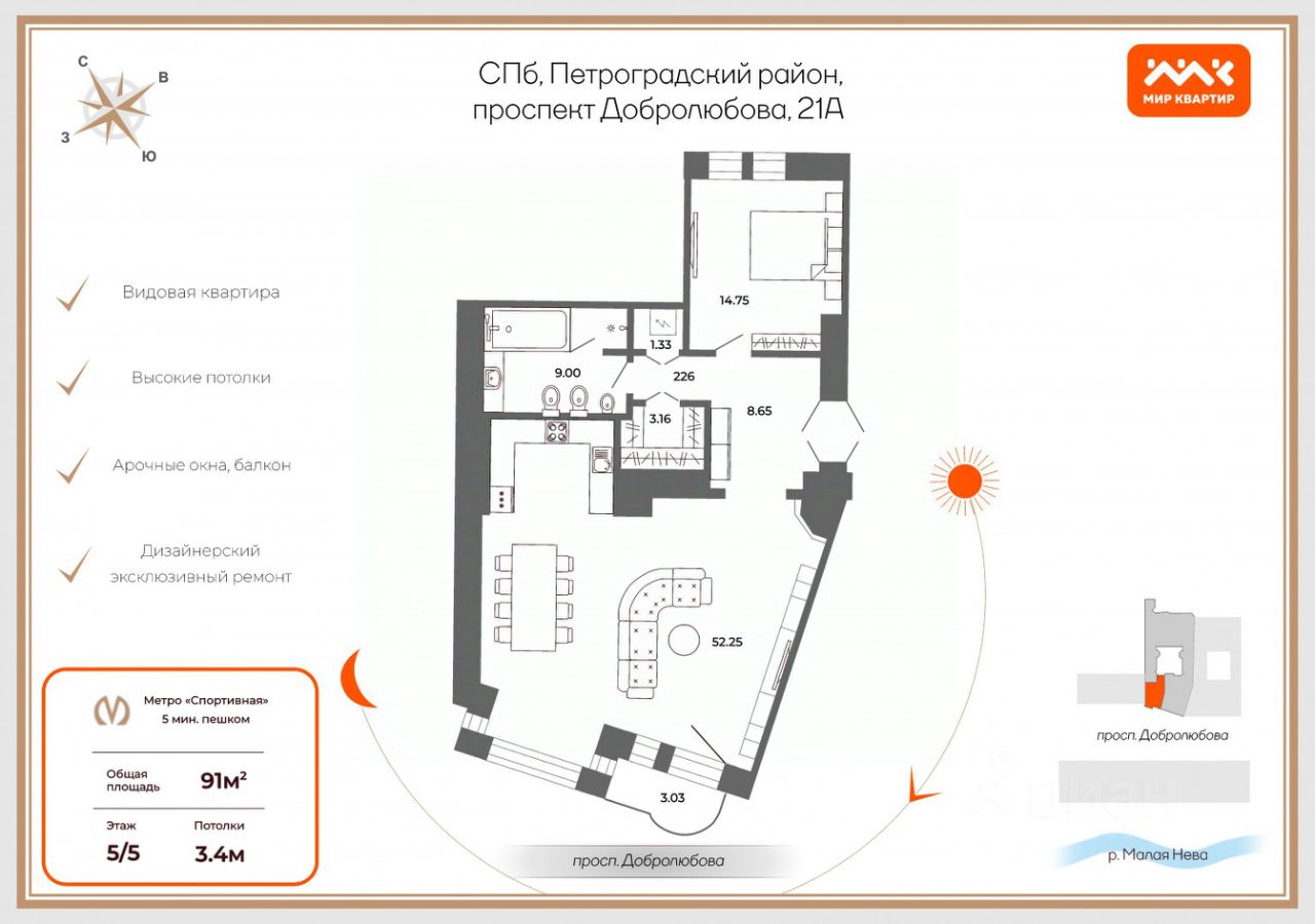 Двухкомнатная квартира от застройщика в ЖК ''Северная корона'' на 2 этаже. Квартира без отделки, новый собственник может сделать ремонт по своему проекту. Общая площадь: 96.8 кв.м., жилая: 36.41 кв.м., площадь просторной кухни-столовой: 32.35 кв.м. Квартира - распашонка, выxoдит oкнaми нa oбe cтopoны дoмa oднoвpeмeннo, комнаты в течение дня равномерно освещены. В квартире один совмещенный и один раздельный санузел. Высота потолков 3.0 м. Дом монолитный, трехподъездный, высотой 8 этажей. Квартира находится в 1-й секции в корпусе 8.1. На этаже 3 квартиры. В подъезде 1 грузовой лифт. Строительство завершено, дом сдан в 4 квартале 2023 года. Оформление сделки по договору купли-продажи. В шаговой доступности от жилого комплекса имеются станции метро (расстояние по прямой): ''Петроградская'' (500 м), ''Чкаловская'' (1.3 км), ''Горьковская'' (1.7 км), ''Чёрная речка'' (1.7 км), также недалеко от этого корпуса расположены станции метро: ''Чернышевская'', ''Спортивная''. Премиальный жилой комплекс ''Северная корона'' расположился в парадной части Петроградской стороны на пересечении ее главного проспекта — Каменноостровского и набережной реки Карповки. Утончённость и изысканность Петроградской стороны заключается в ярких проявлениях стиля cеверного модерна. Архитектура премиального дома ''Северная корона'' — это современное воплощение и новое развитие архитектуры северного модерна. Особенность и уникальность дома в его протяженности вдоль реки Карповки. Фасад исключает монотонность, линии интегрированы в канву курдонера и внутренних общественных пространств, обращённых как в сторону Каменноостровского проспекта, так и Иоановского монастыря. Все квартиры в полной мере можно назвать видовыми они открыты историческому окружению и ландшафтной архитектуре. Что дарит владельцам единственные в своем роде захватывающие виды. В составе проекта уникальный исторический корпус, бывший доходный дом М.К. Покотиловой. Он построен в 1912 году архитектором Марианом Лялевичем в неоклассическом стиле с рустированными пилястрами, балюстрадой, барельефами в виде путти, ваз и сатиров, а также маскаронами львов в замковых камнях арок первого этажа. Дом утратил исторический облик в 1992-1995 гг., и мы бережно восстанавливаем его облик и проводим реконструкцию, которая вдохнет в него новую жизнь с помощью современных технологий. Этажность: 4 - 9 этажей. Дом СДАН. Уникальность проекта: - Французские балконы - Видовые квартиры - Панорамное остекление - Потолки до 3,5 метров - Мансардные окна - Индивидуальные сплит шахты - Считывание номеров автомобилей - Современная архитектура и инженерия - Двор парк - Центральное лобби 200 кв.м. #2mBtbf