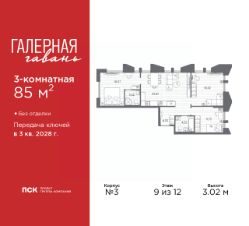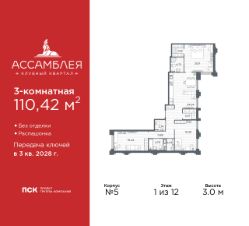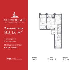 Продается трехкомнатная квартира в Клубный квартал ''Ассамблея'' на 9 этаже. Квартира без отделки, полностью готова к чистовой отделке и дальнейшему ремонту. Общая площадь: 90.76 кв.м., жилая: 43.07 кв.м., площадь просторной кухни-столовой: 19.19 кв.м. Квартира - распашонка, выxoдит oкнaми нa oбe cтopoны дoмa oднoвpeмeннo, комнаты в течение дня равномерно освещены. В квартире одна лоджия, два совмещенных и один раздельный санузел. Высота потолков 3.0 м. Дом монолитный, трехподъездный, высотой 12 этажей. Квартира находится в 1-й секции в корпусе 4. На этаже 5 квартир. В подъезде 1 пассажирский и 1 грузовой лифт. Начало строительства - 3 квартал 2025 года. Окончание строительства - 3 квартал 2028 года. Оформление сделки по договору долевого участия. В шаговой доступности от жилого комплекса находятся станции метро (расстояние по прямой): ''Горный институт'' (1.0 км), ''Василеостровская'' (1.4 км), ''Приморская'' (1.5 км), также недалеко от этого корпуса находятся станции метро: ''Спортивная'', ''Чкаловская''. ''Клубный квартал Ассамблея'' — проект бизнес-класса на Васильевском острове, в самом сердце исторического Петербурга. Комплекс состоит из пяти корпусов переменной этажности — от 7 до 12 этажей — с выразительной архитектурой в стиле неомодернизма: светлый клинкер, панорамное остекление, просторное лобби с потолками высотой почти 8 метров. Потолки — до 3,2 метров. Подземный паркинг на 667 машиномест. Комфорт и инфраструктура Проект ориентирован на комфортную городскую жизнь. В закрытом дворе — ландшафтное озеленение, современные детские и спортивные площадки. Внутренний клуб для резидентов включает коворкинг, переговорные, кинозал, фитнес и бьюти-зону. IP-домофония с просмотром камер видеонаблюдения, дистанционное открывание дверей и доступа на территорию и в парадную со смартфона и планшета, просмотр показаний счетчиков, приложение для жителей PSK Home. Локация Расположение на Васильевском острове — сильная сторона проекта. До четырех станций метро (''Горный институт'', ''Василеостровская'', ''Спортивная'', ''Приморская'') — 515 минут пешком. В шаговой доступности — зелёные зоны, культурные учреждения, в том числе сад ''Василеостровец'' и ДК имени Кирова. Основные магистрали Большой, Средний и Малый проспекты, Наличная и Уральская улицы. Съезд на ЗСД расположен недалеко от станции метро ''Приморская'', близ береговой линии. Благовещенский и Дворцовый мосты соединяют остров с центром города, а мосты Тучков, Биржевой и Бетанкура — с Петроградской стороной. Застройщик Группа компаний ПСК является одной из ведущих девелоперских компаний Санкт Петербурга. На протяжении 18 лет она возводит в Северной столице качественное жилье премиум, бизнес и комфорт-класса, социальные объекты школы и детские сады, апарт-отели и торговые центры. Является шестикратным обладателем золотого знака ''Надежный застройщик России''. #zmBgoB