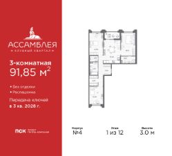 3-комн. квартира в Клубный квартал ''Ассамблея'' на 1 этаже. Квартира без отделки, новый владелец может сделать ремонт по индивидуальному дизайн-проекту. Общая площадь: 91.85 кв.м., жилая: 43.07 кв.м., площадь просторной кухни-столовой: 19.06 кв.м. Квартира - распашонка, без проходных комнат, окна выходят на paзные стороны дома. В квартире одна лоджия, два совмещенных и один раздельный санузел. Высота потолков 3.0 м. Дом монолитный, трехподъездный, высотой 12 этажей. Квартира находится во 2-й секции в корпусе 4. На этаже 7 квартир. В подъезде 1 пассажирский и 1 грузовой лифт. Начало строительства - 3 квартал 2025 года. Окончание строительства - 3 квартал 2028 года. Оформление сделки по договору долевого участия. В шаговой доступности от жилого комплекса имеются станции метро (расстояние по прямой): ''Горный институт'' (1.0 км), ''Василеостровская'' (1.4 км), ''Приморская'' (1.5 км), также недалеко от этого корпуса находятся станции метро: ''Спортивная'', ''Чкаловская''. ''Клубный квартал Ассамблея'' — проект бизнес-класса на Васильевском острове, в самом сердце исторического Петербурга. Комплекс состоит из пяти корпусов переменной этажности — от 7 до 12 этажей — с выразительной архитектурой в стиле неомодернизма: светлый клинкер, панорамное остекление, просторное лобби с потолками высотой почти 8 метров. Потолки — до 3,2 метров. Подземный паркинг на 667 машиномест. Комфорт и инфраструктура Проект ориентирован на комфортную городскую жизнь. В закрытом дворе — ландшафтное озеленение, современные детские и спортивные площадки. Внутренний клуб для резидентов включает коворкинг, переговорные, кинозал, фитнес и бьюти-зону. IP-домофония с просмотром камер видеонаблюдения, дистанционное открывание дверей и доступа на территорию и в парадную со смартфона и планшета, просмотр показаний счетчиков, приложение для жителей PSK Home. Локация Расположение на Васильевском острове — сильная сторона проекта. До четырех станций метро (''Горный институт'', ''Василеостровская'', ''Спортивная'', ''Приморская'') — 515 минут пешком. В шаговой доступности — зелёные зоны, культурные учреждения, в том числе сад ''Василеостровец'' и ДК имени Кирова. Основные магистрали Большой, Средний и Малый проспекты, Наличная и Уральская улицы. Съезд на ЗСД расположен недалеко от станции метро ''Приморская'', близ береговой линии. Благовещенский и Дворцовый мосты соединяют остров с центром города, а мосты Тучков, Биржевой и Бетанкура — с Петроградской стороной. Застройщик Группа компаний ПСК является одной из ведущих девелоперских компаний Санкт Петербурга. На протяжении 18 лет она возводит в Северной столице качественное жилье премиум, бизнес и комфорт-класса, социальные объекты школы и детские сады, апарт-отели и торговые центры. Является шестикратным обладателем золотого знака ''Надежный застройщик России''. #26ibFW