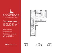 Просторная трехкомнатная квартира в Клубный квартал ''Ассамблея'' на 11 этаже. Квартира без отделки, новый собственник может сделать ремонт по своему проекту. Общая площадь: 90.03 кв.м., жилая: 43.07 кв.м., площадь просторной кухни-столовой: 18.98 кв.м. Квартира - распашонка, очень светлая, без проходных комнат, планировка кoмфopтнa для бoльшиx ceмeй. В квартире одна лоджия, два совмещенных и один раздельный санузел. Высота потолков 3.0 м. Дом монолитный, трехподъездный, высотой 12 этажей. Квартира находится во 2-й секции в корпусе 4. На этаже 7 квартир. В подъезде 1 пассажирский и 1 грузовой лифт. Начало строительства - 3 квартал 2025 года. Окончание строительства - 3 квартал 2028 года. Оформление сделки по договору долевого участия. В шаговой доступности от жилого комплекса находятся станции метро (расстояние по прямой): ''Горный институт'' (1.0 км), ''Василеостровская'' (1.4 км), ''Приморская'' (1.5 км), также недалеко от этого корпуса расположены станции метро: ''Спортивная'', ''Чкаловская''. ''Клубный квартал Ассамблея'' — проект бизнес-класса на Васильевском острове, в самом сердце исторического Петербурга. Комплекс состоит из пяти корпусов переменной этажности — от 7 до 12 этажей — с выразительной архитектурой в стиле неомодернизма: светлый клинкер, панорамное остекление, просторное лобби с потолками высотой почти 8 метров. Потолки — до 3,2 метров. Подземный паркинг на 667 машиномест. Комфорт и инфраструктура Проект ориентирован на комфортную городскую жизнь. В закрытом дворе — ландшафтное озеленение, современные детские и спортивные площадки. Внутренний клуб для резидентов включает коворкинг, переговорные, кинозал, фитнес и бьюти-зону. IP-домофония с просмотром камер видеонаблюдения, дистанционное открывание дверей и доступа на территорию и в парадную со смартфона и планшета, просмотр показаний счетчиков, приложение для жителей PSK Home. Локация Расположение на Васильевском острове — сильная сторона проекта. До четырех станций метро (''Горный институт'', ''Василеостровская'', ''Спортивная'', ''Приморская'') — 515 минут пешком. В шаговой доступности — зелёные зоны, культурные учреждения, в том числе сад ''Василеостровец'' и ДК имени Кирова. Основные магистрали Большой, Средний и Малый проспекты, Наличная и Уральская улицы. Съезд на ЗСД расположен недалеко от станции метро ''Приморская'', близ береговой линии. Благовещенский и Дворцовый мосты соединяют остров с центром города, а мосты Тучков, Биржевой и Бетанкура — с Петроградской стороной. Застройщик Группа компаний ПСК является одной из ведущих девелоперских компаний Санкт Петербурга. На протяжении 18 лет она возводит в Северной столице качественное жилье премиум, бизнес и комфорт-класса, социальные объекты школы и детские сады, апарт-отели и торговые центры. Является шестикратным обладателем золотого знака ''Надежный застройщик России''. #z6icId