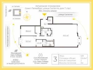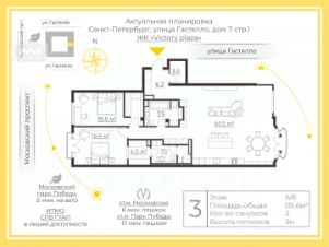 Арт. 95747584 Эксклюзивное предложение в клубном доме ''Victory Plaza''!Квартира площадью 132,5 м2 расположена на 6 этаже в семиэтажном доме в Московском районе. В квартире функциональная планировка: светлая кухня-гостиная 33,6 м2 с эркером и зимним садом, уютные тихие спальни с окнами во двор и собственными гардеробными 23,3 + 22,5 м2, 2 санузла (+ постирочная), спальня-кабинет (свободное назначение) 15,5 м2. Высота потолков 3,0 м.Украшением квартиры являются окна с французским балконом и завораживающий ВИД на Чесменский дворец!Квартира делалась для себя. Выполняется функциональный ремонт по дизайн-проекту с применением премиальных отделочных материалов (чистовая отделка). - Установлена приточно-вытяжной вентиляции с оборудованием Mitsubishi, - сделана шумоизоляция и проведена электрика по всей квартире, - стены и потолки подготовлены под окраску, - лепнина гипсовая,- сантехника Deante (душевые смесители, трапы, отдельностоящий напольный кран для ванны, гигиенические души), - инсталляции Kkpol, - керамогранит Zodiac широкоформатный размер 1400*2700, - плитка в прихожую сделана по заказу из плитки Zodiac, - инженерная доска Coswick (''французская елка'' 45 градусов) не будет уложена.Жилой комплекс премиум-класса Victory Plaza 2022 года постройки это новая визитная карточка Московского района. Вдохновение французской архитектурой и филигранное исполнение делают дом роскошным местом для жизни. В Victory Plaza всего 128 квартир.Притягательная архитектура Victory Plaza вдохновлена стилем парижских домов XIX века. Фасады, облицованные натуральным камнем, неподражаемые французские балконы, эркеры, большие окна делают облик дома утонченным и элегантным.Парадный вход Victory Plaza обращен в сторону Московского проспекта. Благодаря тому, что дом имеет форму каре, двор полностью закрыт от посторонних глаз. Через него осуществляется доступ в парадные.Интерьеры парадных и холлов Victory Plaza выполнены в стиле модерн. Плавные изогнутые линии, утонченность форм, приглушенный свет создают аристократичную атмосферу. В отделке использованы дорогостоящие натуральные материалы: дерево, мрамор, венецианская штукатурка на стенах. Лифты класса ''люкс'' выполнены в той же цветовой гамме, что и весь интерьер, со спуском в паркинг на 137 мест. Отлично развитая инфраструктура Московского района. В шаговой доступности есть всё для комфортного проживания. Рядом Московский парк Победы, Чесменская церковь, Чесменский сквер, общеобразовательные учреждения, институты, Спортивный клуб ОНИКС, 2 детских садика, медицинские и развлекательные учреждения, магазины, супермаркеты, кафе.Улица Гастелло одна из самых спокойных и уютных улиц в Московском районе. Она огибает Victory Plaza с двух сторон, поэтому клубный дом становится местом для уединенной и спокойной жизни. При этом до выезда на правительственный Московский проспект менее минуты. В пешей доступности располагается парк Победы с прудами и аллеями. До аэропорта ''Пулково'' дорога займет всего 15 минут на