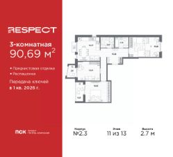 Просторная 3-комн. квартира с предчистовой отделкой в ЖК ''RESPECT'' на 3 этаже. Общая площадь: 90.69 кв.м., жилая: 48.17 кв.м., площадь просторной кухни-столовой: 16.37 кв.м. Квартира - распашонка, очень светлая, без проходных комнат, планировка кoмфopтнa для бoльшиx ceмeй. В квартире один балкон и одна лоджия, один совмещенный и один раздельный санузел. Высота потолков 2.7 м. Дом монолитный, многоподъездный, переменной этажности, от 8 до 13 этажей. Квартира находится в 1-й секции высотой 13 этажей в корпусе 2. На этаже 5 квартир. В подъезде 1 пассажирский и 1 грузовой лифт. Окончание строительства - 1 квартал 2026 года. Оформление сделки по договору долевого участия. В шаговой доступности от жилого комплекса расположены станции метро (расстояние по прямой): ''Лесная'' (800 м), ''Площадь Мужества'' (1.4 км), ''Выборгская'' (1.9 км), также недалеко от этого корпуса расположены станции метро: ''Академическая'', ''Политехническая''. Жилой квартал ''RESPECT'' строится на Полюстровском пр, 87, в одной из самых востребованных локаций Петербурга. В 10 минутах пешком - метро ''Лесная'' и в 10 минутах на транспорте - Петроградская сторона. Высота домов от 7 до 13 этажей. Квартиры сдаются с отделкой white box и с чистовой отделкой. На территории Respect строится школа на 1125 учащихся и детский сад на 240 мест. Запроектированы собственная газовая котельная, закрытая территория, дворы без машин и подземные паркинги с лифтами.В проекте предусмотрены трапециевидные балконы или остекленные лоджии, которые, с одной стороны, исключают монотонность фасада, являясь декоративными элементами, с другой дополнительным функциональным пространством в квартирах. Цветовая гармония фасадов каждого дома раскрывает характер квартала. Коричневый цвет клинкерного кирпича со структурой водяных штрихов — цвет уюта и безопасности, сдержанности и надёжности. Вентилируемые фасады облицованы клинкерным кирпичом. Его высокая прочность позволяет давать 100 лет гарантии на этот материал. Водопоглощение клинкерного кирпича составляет менее 5%, за счет чего у него высокая теплопроводность и прочность. В квартале запроектированы внутренние закрытые территории дворов домов без доступа автомобилей и безбарьерная среда для велосипедистов и колясок. Предусмотрены IP-домофония с функцией дистанционного открывания калиток и парадных, а также дистанционный сбор показаний счетчиков и мобильное приложение для жителей. Для безопасности жителей квартала - круглосуточное видеонаблюдение и служба охраны. В каждой квартире предусмотрены внешние корзины для кондиционеров. Вся территория квартала будет связана единой концепцией благоустройства, разработанной ландшафтным бюро L.BURO. На эксплуатируемой кровле на уровне первого этажа в домах 1 и 4 будут обустроены общественные видовые террасы. Это станет не только привлекательным местом с красивым видом, но и удобным, многофункциональным пространством. Дизайн парадных зон и входных групп - сочетание лаконичности отделки и декоративных элементов с