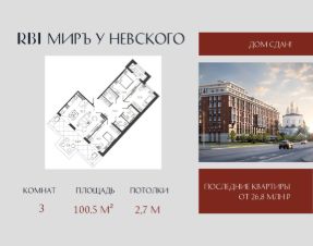 Объект забронирован клиентом!Клубный дом ''МИРЪ'' в самом центре Петербурга — воплощение идеальной картины мира для истинных ценителей прекрасного. Дом строится на Миргородской улице, в двух шагах от Невского проспекта и Московского вокзала. Из окон квартир приятно созерцать красоту Феодоровского собора и вдохновляться захватывающей панорамой Петербурга. В шаговой доступности — метро ''Площадь Восстания'', крупные торговые центры и ''Старо-Невский'' проспект с бутиками мировых премиум-брендов. Утром достаточно выйти из парадной, чтобы через 5 минут расположиться в кресле ''Сапсана'' и с комфортом добраться до Москвы. Путь до КАД и ЗСД на автомобиле займёт не более 15 минут, до аэропорта ''Пулково'' — полчаса. Камерная атмосфера создаётся за счёт деления на два корпуса и небольшого количества квартир в доме — их всего 263. Корпуса объединены триумфальной аркой, которая формирует закрытый контур внутреннего двора. Статус дома подчеркивают парадные холлы с арочными пролётами, витражным остеклением и произведениями искусства. Автомобилисты смогут спуститься в подземный паркинг на лифте прямо со своего этажа. Гостевую стоянку организуют вне комплекса — чтобы не нарушать безопасность двора. Для жителей в доме появится приватный фитнес-зал. Также в большом корпусе появится муниципальный детский сад с собственной игровой площадкой за пределами камерного пространства дома. В каждой парадной — просторные колясочные. Велосипеды вы сможете оставить на оборудованных велопарковках. Во внутреннем дворе появится живописный сквер, а в центре появится своеобразная ''зелёная комната'' с воздушным навесом и обогревателями. Детские игровые зоны воплощают природные формы и выполнены из экологичных материалов. В южной части двора расположится амфитеатр с отделкой из натурального дерева. Свободный Wi-Fi позволит подключиться к работе онлайн прямо во дворе или из парадных холлов. Территория дома полностью огорожена и охраняется круглосуточно. Войти в парадные можно только со стороны внутреннего двора по бесконтактному электронному ключу. Спланировать встречу гостей легко и удобно через специальное приложение для жителей. Площадь квартир варьируется от 26 до 146 м². Планировки с просторными кухнями-гостиными, мастер-спальнями, которые предусматривают отдельный санузел и выделенную гардеробную. А квартиры на верхних этажах дома с трёхметровыми потолками, панорамными окнами и видовыми террасами, откуда обозревается исторический центр города.