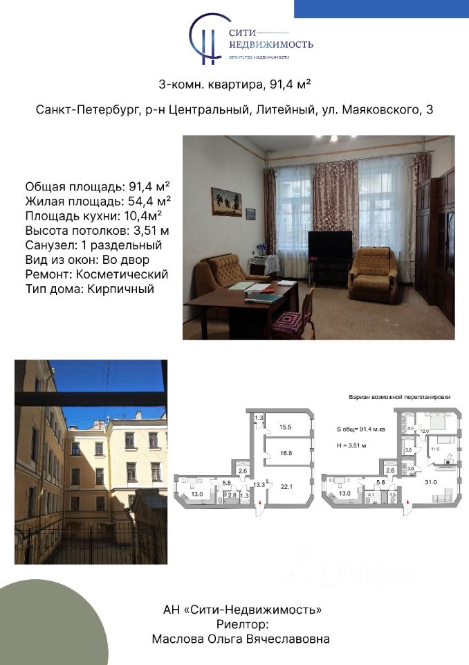 Продается трехкомнатная квартира в центре Санкт-Петербурга! Квартира у метро ''Маяковская'' с закрепленным парковочным местом!!! Последний Капитальный Ремонт в 1987 году, железобетонные перекрытия. Прямая продажа! Быстрый выход на сделку! Без обременений! Полная стоимость в договоре! Уникальная локация дома позволяет пользоваться всеми преимуществами проживания в историческом центре города как для собственного проживания, так и для сдачи квартиры в аренду! Шикарный инвестиционный проект! Вход в парадную со стороны улицы. Единственная квартира на лестничной площадке. Квартира двусторонняя с изолированными комнатами. Отличная планировка, двухсторонняя. Все комнаты изолированные. Высота потолков 3, 51 метра. Капитальный ремонт в 1987 г. Перекрытия железобетонные. На первом этаже расположена Нотариальная контора (Нежилое помещение) вход отдельный со двора. Подходит под ипотеку, субсидию, мат.капитал.