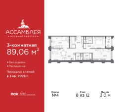 Просторная 3-комн. квартира в Клубный квартал ''Ассамблея'' на 11 этаже. Квартира без отделки, новый владелец может сделать ремонт по индивидуальному дизайн-проекту. Общая площадь: 106.87 кв.м., жилая: 48.23 кв.м., площадь просторной кухни-столовой: 24.04 кв.м. Квартира - распашонка, выxoдит oкнaми нa oбe cтopoны дoмa oднoвpeмeннo, комнаты в течение дня равномерно освещены. В квартире два балкона, два совмещенных и один раздельный санузел. Высота потолков 3.0 м. Дом монолитный, черырехподъездный, высотой 12 этажей. Квартира находится в 1-й секции в корпусе 5. На этаже 6 квартир. В подъезде 1 пассажирский и 1 грузовой лифт. Окончание строительства - 3 квартал 2028 года. Оформление сделки по договору долевого участия. В шаговой доступности от жилого комплекса имеются станции метро (расстояние по прямой): ''Горный институт'' (1.0 км), ''Василеостровская'' (1.4 км), ''Приморская'' (1.5 км), также недалеко от этого корпуса находятся станции метро: ''Спортивная'', ''Чкаловская''. ''Клубный квартал Ассамблея'' — проект бизнес-класса на Васильевском острове, в самом сердце исторического Петербурга. Комплекс состоит из пяти корпусов переменной этажности — от 7 до 12 этажей — с выразительной архитектурой в стиле неомодернизма: светлый клинкер, панорамное остекление, просторное лобби с потолками высотой почти 8 метров. Потолки — до 3,2 метров. Подземный паркинг на 667 машиномест. Комфорт и инфраструктура Проект ориентирован на комфортную городскую жизнь. В закрытом дворе — ландшафтное озеленение, современные детские и спортивные площадки. Внутренний клуб для резидентов включает коворкинг, переговорные, кинозал, фитнес и бьюти-зону. IP-домофония с просмотром камер видеонаблюдения, дистанционное открывание дверей и доступа на территорию и в парадную со смартфона и планшета, просмотр показаний счетчиков, приложение для жителей PSK Home. Локация Расположение на Васильевском острове — сильная сторона проекта. До четырех станций метро (''Горный институт'', ''Василеостровская'', ''Спортивная'', ''Приморская'') — 515 минут пешком. В шаговой доступности — зелёные зоны, культурные учреждения, в том числе сад ''Василеостровец'' и ДК имени Кирова. Основные магистрали Большой, Средний и Малый проспекты, Наличная и Уральская улицы. Съезд на ЗСД расположен недалеко от станции метро ''Приморская'', близ береговой линии. Благовещенский и Дворцовый мосты соединяют остров с центром города, а мосты Тучков, Биржевой и Бетанкура — с Петроградской стороной. Застройщик Группа компаний ПСК является одной из ведущих девелоперских компаний Санкт Петербурга. На протяжении 18 лет она возводит в Северной столице качественное жилье премиум, бизнес и комфорт-класса, социальные объекты школы и детские сады, апарт-отели и торговые центры. Является шестикратным обладателем золотого знака ''Надежный застройщик России''. #z6bg85
