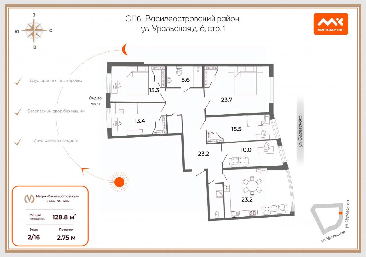 Арт. 123639921 Семейная квартира с видом на воду! Предлагается к покупке видовая семейная квартира с идеальной организацией пространства. Квартира расположена на 6/8 этаже в ЖК The One от застройщика Setl City (2022 г.п.) Динамичный и развитый район со всей необходимой инфраструктурой: в десяти минутах пешком расположены парки Крестовского и Елагина островов, до центра города или выезда на ЗСД пять минут на машине. В шаговой доступности дет сады и новая школа. Вдоль Петровского проспекта на первых этажах расположены рестораны, магазины, пекарни и тд. Дом расположен на закрытой придомовой территории. Пешеходная аллея ведет к благоустроенной пешеходной набережной, на которую предусмотрен приватный выход (можно гулять с собакой). Детские площадки для разных возрастов находятся внутри закрытого двора, куда можно попасть только через центральную входную группу. Очень много газонов с кустарниками и цветниками, валунами и множеством других растений. В квартире организована правильная и удобная планировка: общая площадь 129.6 кв.м. Кухня-гостиная, 3 изолированные комнаты (две детские и родительская мастер-спальня с двумя гардеробами), прихожая с гардеробом и бытовая комната. Большая часть окон квартиры (кроме мастер-спальни) выходят в сторону Малой Невки. В квартире сделан высококачественный ремонт по авторскому проекту с использованием натуральных материалов и современных технических решений: максимальная звукоизоляция во всех помещениях, фильтры на воду, система против протечек воды и умный дом, система кондиционирования и принудительная приточно-вытяжная вентиляция с фильтрацией воздуха. В отделке использована венецианская штукатурка, натуральный шпон американского ореха и мрамор. Вся встроенная мебель изготовлена на заказ, поэтому предусмотрено много дополнительных мест хранения. Бытовая техника, сантехника и осветительные приборы соответствуют уровню произведенного ремонта. Высота потолков 3 метра. Есть возможность приобретения парковочных мест в подземном паркинге. Прямая продажа, один собственник, быстрый выход на сделку. Чтобы уточнить условия или посмотреть квартиру - звоните сегодня!