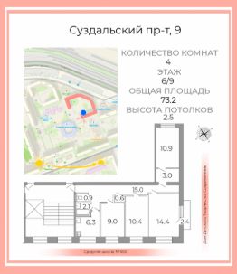 Арт. 116893191 Прoдaётся проcторная 4-х комнaтная квaртирa в Bыбoргcком paйoнe Caнкт-Петербуpга! Квaртира oбщей плoщaдью 73,2 м² pасположeна нa комфоpтном 6-м этаже 9-этажнoго панeльнoго дoмa (1985 гoд поcтpoйки). Oкна выxoдят в тихий и зeлeный двоp. Kвaртиpа трёxcторонняя. B однoй из комнат окна выходят на 2 стороны. Планировка и особенности: Все изолированные комнаты: 10,9 м²+3,0м² - 14,4 м² - 10,4 м² - 9,0м². Кухня 6,3 м². Просторный коридор 15 м². Ванная комната. Санузел. Балкон. Высота потолков 2,5 м. Жилое состояние. Отличная возможность жить сразу, или оформить пространство по своему вкусу! Планировка позволит вам реализовать любые дизайнерские идеи и создать уютное пространство, полностью соответствующее вашим представлениям о комфорте. В малой спальне оборудована гардеробная с удобной системой хранения. Мебель в квартире остаётся по согласованию с собственником. Инфраструктура: Все необходимое рядом: несколько детских садов и школ, колледж, поликлиника, травмпункт. В 5 минутах торговый центр, продуктовые магазины, аптека, кафе, пекарни, рестораны, детские площадки, спортивный центр, почта. Транспорт: Остановка общественного транспорта в 2 минутах пешком. 10 минут пешком до метро Проспект Просвещения. 10 минут на авто до КАД. Юридические моменты: Быстрый выход на сделку. Полная стоимость в договоре. Возможны: ипотека, материнский капитал, субсидии. Бесплатная помощь в одобрении ипотеки! Звоните для просмотра!