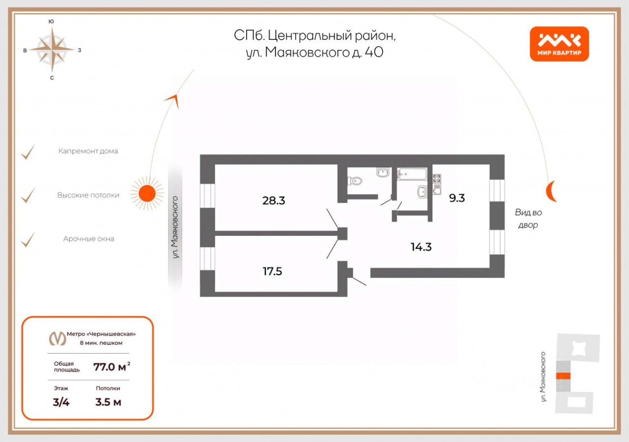 Арт. 116887046 Вашему вниманию предлагается светлая, просторная 2-комнатная квартира в доходном доме майора П. И. Трута. Арх. стиль - ''Ранняя эклектика''. Архитектор: Цулауф Александр Егорович, 1858 гг. постройки. Дом прошел капитальный ремонт в 1971 году. Вход с закрытого двора. Легкая пологая лестница без лифта. Квартира расположена на 3 этаже 4 этажного кирпичного дома, общей площадью 77 м2, имеет рациональную двустороннюю планировку: 2 арочных окна, расположенные по фасаду дома, обращены на улицу Маяковского, 2 других окна направлены в тихий зеленый и закрытый двор, в котором есть возможность парковать автомобиль. Кухня-гостиная - 15 м2 2 спальни - 22.3 + 17.5 м2 Санузел - 3.9 м2 Ванная комната - 3.6 м2 Главной особенностью конечно же являются арочные окна с потолками 3.5 метра, за счет которых квартира всегда наполнена воздухом и дневным светом! Квартира полностью мебелирована и оснащена всей необходимой техникой. Проведен высокоскоростной интернет. Установлен теплый пол, бойлер и персональный домофон с видео трансляцией. Так же установлен пульт охраны. КВАРТИРА ТРЕБУЕТ РЕМОНТА! Дом расположен в пешей доступности от метро Маяковская, Площадь Восстания и Чернышевская. Рядом находятся все исторические достопримечательности города памятники, театры, музеи, а также магазины, поликлиники, школы и детские сады. Прямая продажа. Собственность физического лица более 5 лет. Никто не прописан. Без обременений. Оперативные показы и быстрый выход на сделку! Предлагаем ПРЕМИАЛЬНОЕ обслуживание для требовательных клиентов. Оперативно организуем просмотр, предоставим полную информацию по объекту. 20 лет работы с требовательными клиентами подготовили нас к решению ВАШИХ сложных задач. Будем рады знакомству! Ул. Рубинштейна, д.8.