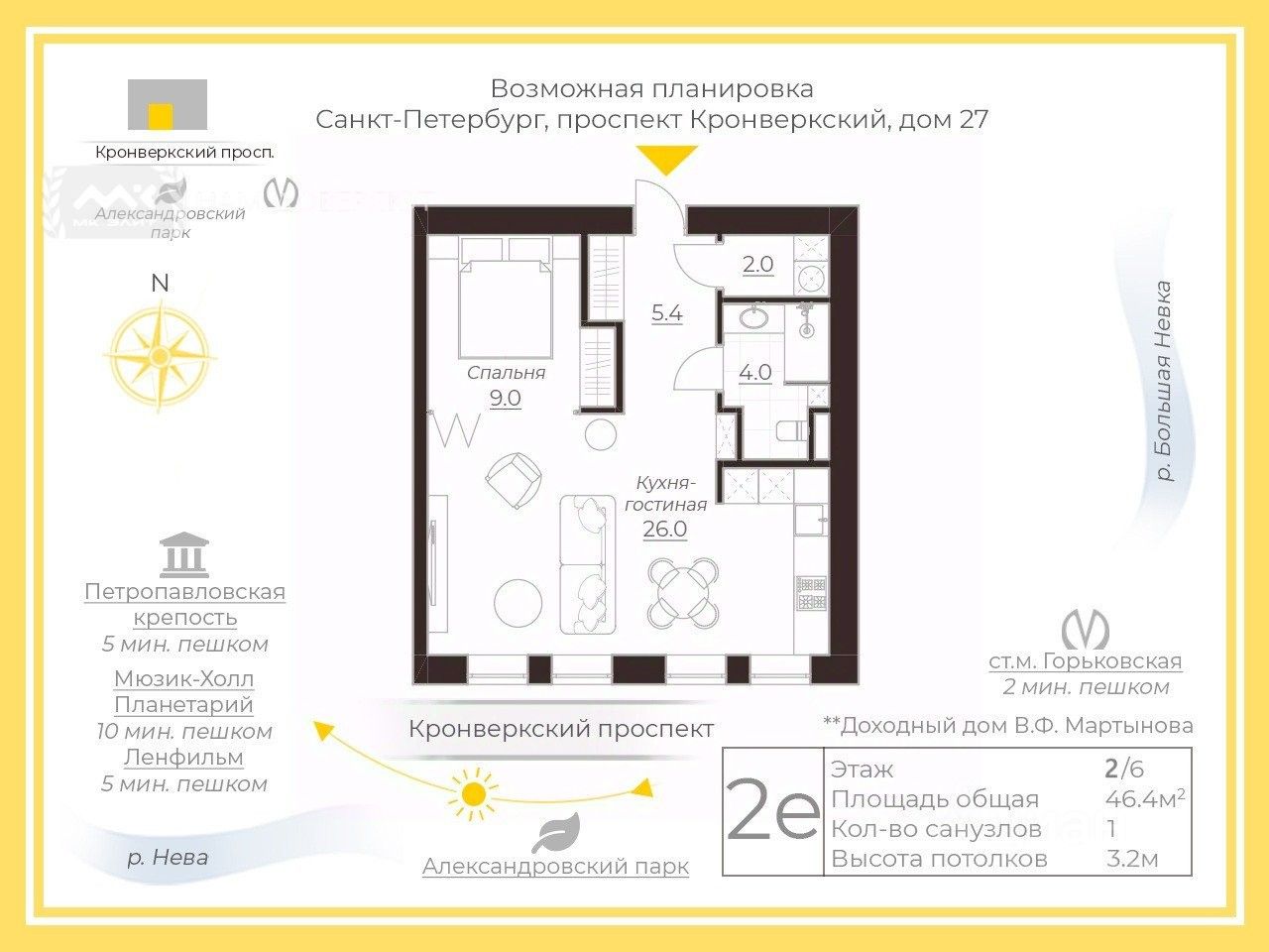 Арт. 105017318 МЕСТО Александровский парк был основан в 1842 году по инициативе Е.Ф. Канкрина. Составить проект министр поручил архитектору своего ведомства — А.М. Куци. В наше время парк одно из самых популярных среди туристов мест Петербурга. Здесь проходят массовые гуляния, фестивали, концерты. О ДОМЕ Доходный дом В. Ф. Мартынова , возведен в 1911-1912 гг. по проекту архитекторов В. Ф. Иванова и В. В. Шауба в стиле модерн. В 1995 году была реконструкция дома с заменой перекрытий на железобетонные. Так же есть закрытый двор, где можно припарковать автомобиль. Парадный вход с Кронверкского проспекта, в парадной консьерж. О КВАРТИРЕ Квартира расположена на 2 этаже, общая площадь 46,4 кв.м., высота потолков 3,2 м. Все окна обращены на Александровский сад. Объект требует ремонта, что позволит сделать отделку, учитывая все потребности.