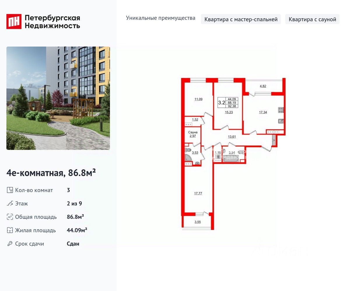 Продается уютная, семейная 3-комнатная квартира от застройщика в жилом комплексе ''Прайм Приморский'' в динамичном Приморском районе. До метро можно добраться на транспорте всего за 15 минут. Мастер-спальня с собственной ванной комнатой. Самое приватное пространство в вашей квартире. Сауна в ванной комнате. Расслабьтесь и восстановите силы, как в СПА-салоне. Уникальная, функциональная европланировка, большая кухня-гостиная 18.05 м², просторная прихожая 13.61 м². Общая площадь квартиры - 86.8 м², жилая 44.09 м², высота потолка 2.77 м. Квартира продается с отделкой ''NORD LINE SILVER ВК''. Что особенного в ЖК ''Прайм Приморский''? • Живописные виды на Шуваловский карьер и лесной массив • ''Парящие'' французские балконы • Центральная входная группа • Креативное пространство в центре проекта, летняя терраса для отдыха • Приватные лаундж-зоны на крыше домов (3 корпус)