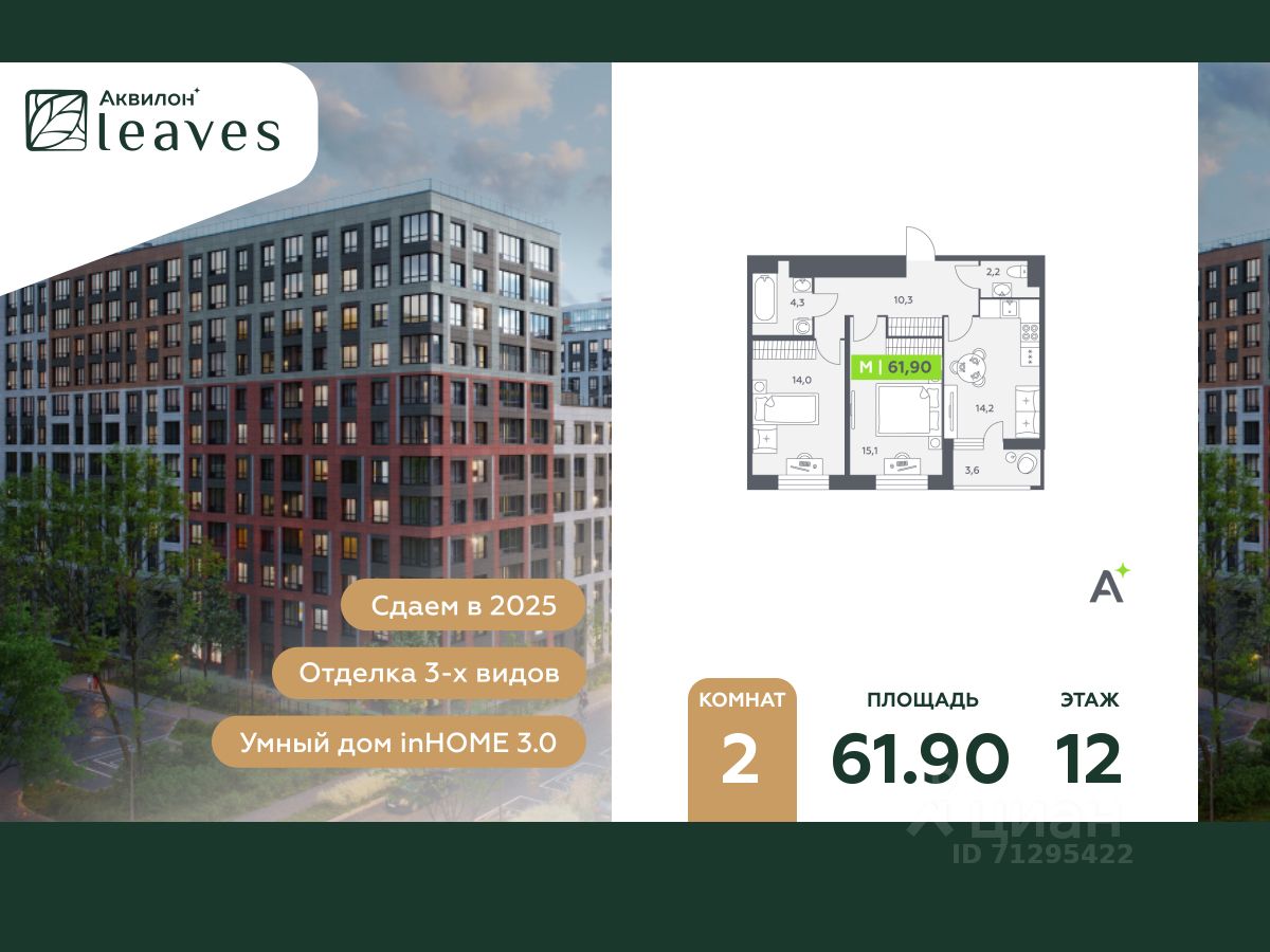 Купи квартиру в ЖК ''Аквилон Leaves''! Отделка В квартире выполнена предчистовая отделка WhiteBox +Возможен дозаказ отделки в любом из 3 цветов: SAND, TERRA, GRAPHITE Отделка входит в стоимость квартиры в ДДУ ЖК ''Аквилон Leaves'' Жилой комплекс класса бизнес-лайт ''Аквилон Leaves'' воплощает идеальную синергию природы, технологий и дизайна. В одном из самых престижных районов Санкт-Петербурга мы создаем функциональную жилую среду, которая позволит максимально быстро и удобно решать бытовые вопросы, сохраняя ценное время для семьи и любимых занятий. -Малошумные лифты -Сквозные парадные -Светопрозрачные входные группы -Увеличенная высота первого этажа -Безбарьерная среда -Подземный паркинг Стандарты Группы Аквилон для вашей комфортной жизни Thermo-S экономия на коммунальных платежах за счет дополнительно утепленных стен, кровли и цоколя. Энергоэффективные окна с селективным покрытием и аргоновым заполнением Soundstop - дополнительная шумоизоляция внутренних перегородок и межэтажных перекрытий, шумозащитные окна, малошумные лифты Light-in - в квартирах устанавливаются широкоформатные окна, увеличены на 30%. Высота подоконников на уровне 60 см от пола. Vent-in - в каждой комнате есть клапаны индивидуальной вентиляции, которые обеспечивают приток свежего воздуха с улицы. inHOME умный дом в каждой квартире Интеллектуальная цифровая система, которая позволит дистанционно решать бытовые вопросы, управлять квартирой и экономить на оплате коммунальных услуг. В состав inHOME входят: IP-домофон, Face key, ''умные'' счетчики, датчики протечки, дистанционное отключение розеток, и т.д. Двор ваш личный парк Благоустройство двора от студии ландшафтного дизайна MEGABUDKA отсылает нас к образу зеленого листа. Современная архитектура гармонирует с окружающей средой, а экологические стандарты и ''умные'' системы обеспечивают ежедневный комфорт. -Зонирование на площадки для активного и спокойного отдыха. -Ландшафт с геопластикой и рельефом напоминает естественную красоту природных парков. -Всесезонные растения -Высаживаются взрослые деревья и кустарники Локация и инфраструктура Помимо разнообразной инфраструктуры, рядом с комплексом расположен Пулковский парк и сад ''Дубовая роща''. У жителей будут все возможности для отдыха на свежем воздухе. Велопрогулка, пробежка или летний пикник наслаждайтесь природой, не уезжая далеко загород. -10 мин. до м. Московская -15 мин. до м. Звездная -15 мин. до аэропорта Пулково -30 мин. до Невского пр. #ZZeF61