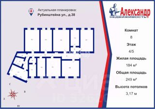 1698008 Квартира 249 кв.м в самом центре Санкт-Петербурга, у станции метро 'Достоевская', в 5 мин. ходьбы от Невского проспекта. Рядом знаменитая площадь 'Пять углов', Владимирский собор, набережная р. Фонтанки и другие архитектурные красоты северной столицы. Квартира расположена в историческом здании, в котором проживал композитор и пианист А.Г. Рубинштейн. Подойдет для большой семьи, ценящей просторные планировочные решения, помещения с высокими потолками, особую атмосферу исторической архитектуры. В комнатах и подъезде сохранена богатая лепнина, высота потолков 3,17 м, просматривается бывшая анфилада комнат с барельефами над дверными проемами - особенность планировок квартир ХIХ в. Два входа в квартиру из разных подъездов позволит при желании разделить данное помещения на 2 квартиры. Также квартира имеет долгосрочную инвестиционную привлекательность. Планировка двусторонняя. Двор с местами для парковки автомобилей и воротами на Загородный пр. и ул. Рубинштейна. Из квартиры два выхода. Подъезд с лифтом. Вся сумма в договоре. Записывайтесь на просмотр.