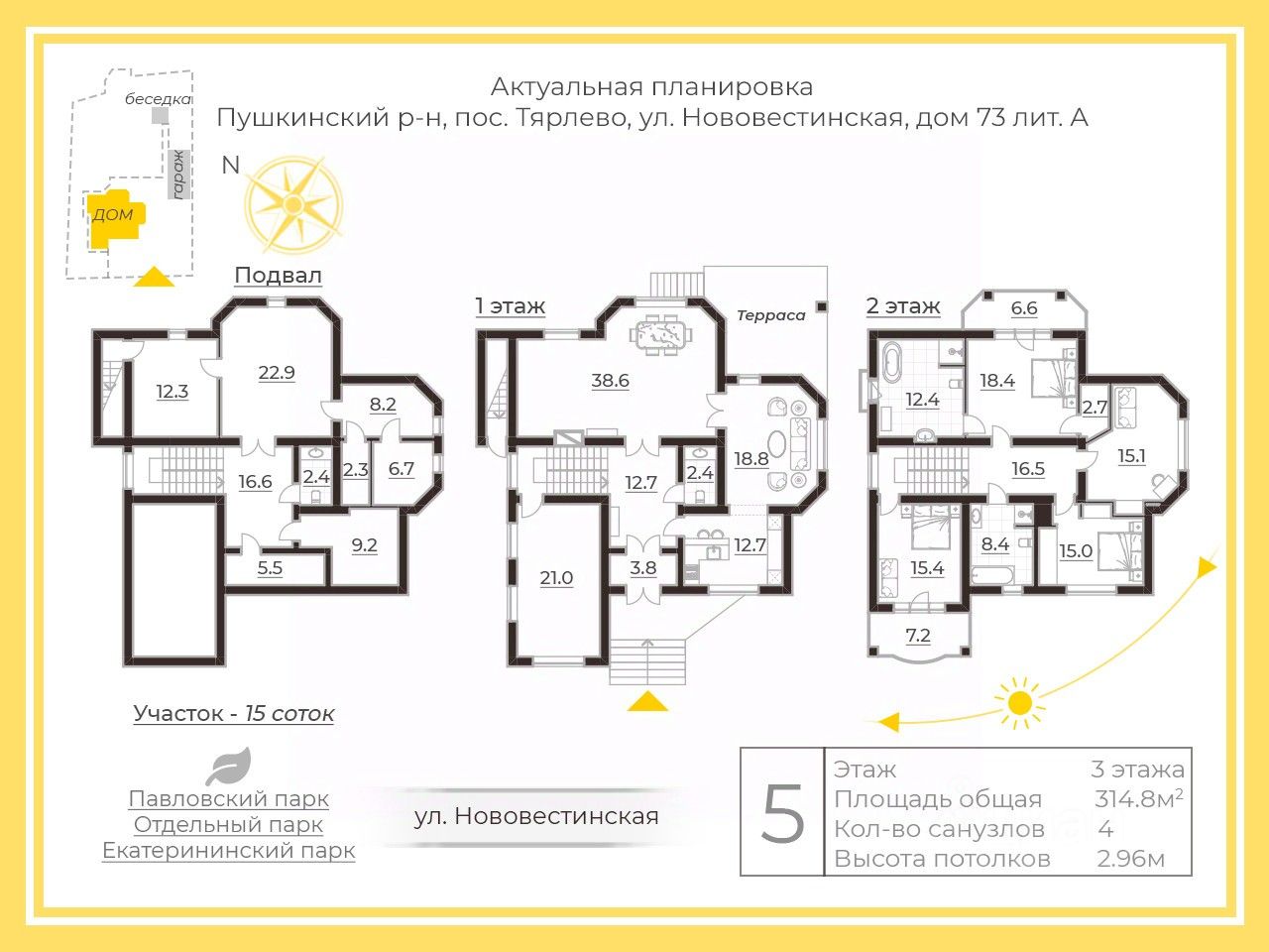 Арт. 69873689 Продаётся дом для большой семьи на тихой тупиковой улице в поселке Тярлево, всего в 20 минутах от Санкт-Петербурга. Это идеальное место для тех, кто ценит уединение и комфорт. Дом площадью 315 квадратных метров расположен на участке в 15 соток. Этот дом обладает всем необходимым для комфортной жизни: кухня, оборудованная техникой Miele и Kuppersbusch, большая столовая и гостиная с камином, гостевая комната с балконом, кабинет, две детских комнаты и мастер-спальня с балконом, а также три санузла. В доме есть большой подвал с несколькими комнатами. На участке расположен гараж на несколько машин и беседка. Дом выполнен из качественных материалов, а ремонт подчёркивает его статусность. Кроме того, он находится в престижном районе рядом с Павловским парком, что делает его ещё более привлекательным для тех, кто хочет жить в окружении природы и при этом иметь возможность быстро добраться до города. Если вы ищете дом, который будет отражать ваш высокий статус и станет местом, где вы сможете наслаждаться жизнью в полной мере, то этот вариант — именно то, что вам нужно. Звоните прямо сейчас, чтобы узнать больше информации и договориться о просмотре!