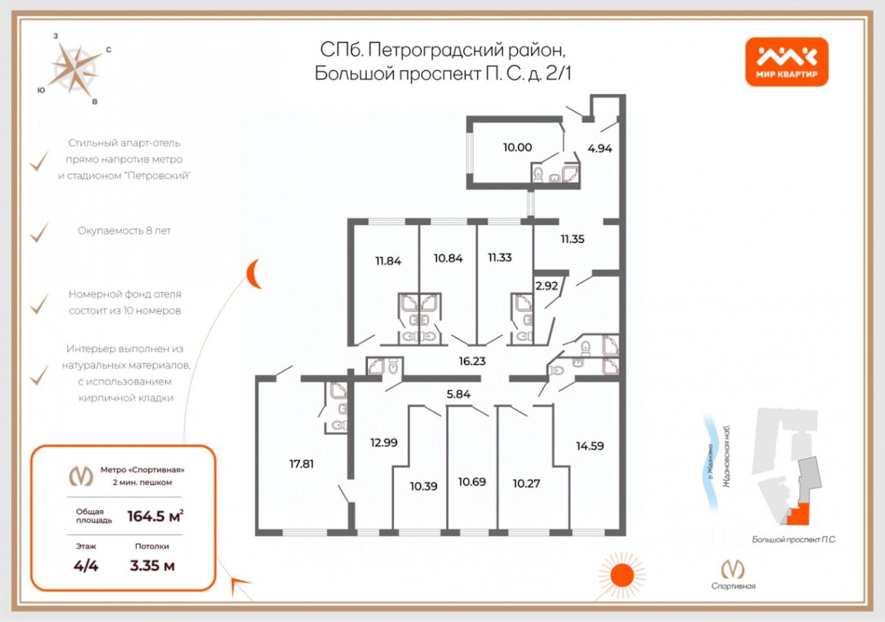 Арт. 68655069 Всего в 1 минуте от метро Спортивная, апарт-отель с окупаемостью 8 лет предлагает изысканную архитектуру и потрясающие виды. Апарт-отель расположен на 4 этаже и имеет два отдельных входа с улицы — парадный с Большого проспекта П.С. и со двора. Три входа в отель позволяют вам легко разделить его на три полноценных помещения, что открывает массу возможностей для бизнеса. Интересные и функциональные решения: Высота потолков 3,8 м создает ощущение простора и света. Номерной фонд включает 10 комфортабельных номеров, функциональную кухню-гостиную, выделенную постирочную зону и достаточные места под хранение и рабочее пространство. Здесь вы сможете реализовать любые планировочные идеи. Парковка в вашем распоряжении: просторный и тихий двор предлагает парковочные места для ваших гостей. 15 квт официально оформленной мощности. Мини-отель в окружении садов и бутиков, с удобным тихим двором и современными удобствами. Приглашаем на просмотр Предлагаем ПРЕМИАЛЬНОЕ обслуживание для требовательных клиентов. Оперативно организуем просмотр, предоставим полную информацию по объекту. 20 лет работы с требовательными клиентами подготовили нас к решению ВАШИХ сложных задач. Будем рады знакомству! Ул. Рубинштейна, д.8.