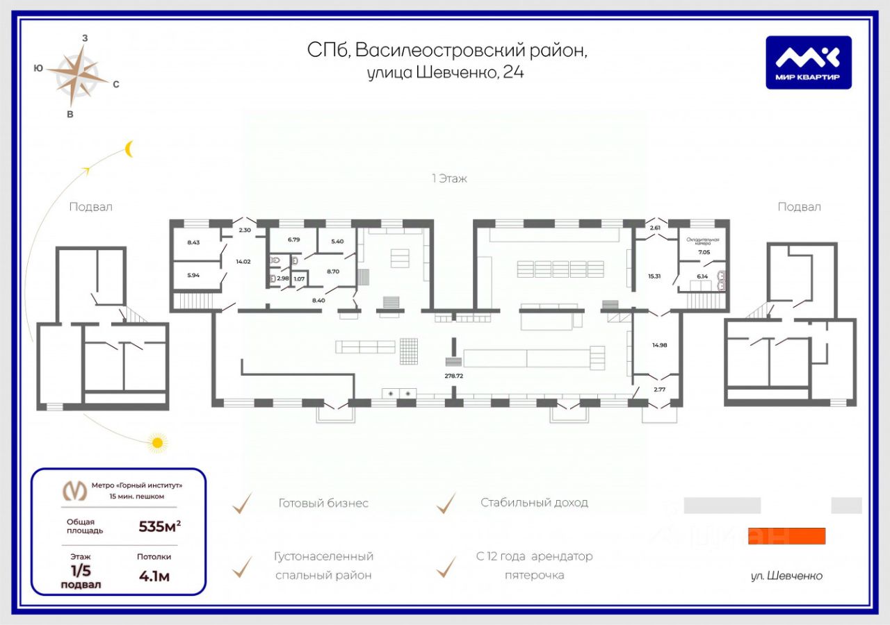 Арт. 130033141 Продаётся торговое помещение с сетевым арендатором ПЯТЕРОЧКА. Отличное месторасположение - густо населённый спальник. Помещение находится в 5-ти этажном доме, в окружении многочисленных домов, учебных заведений. • 4 минуты до остановки общественного транспорта,• 10 минут до метро на транспорте Основные характеристики:• Общая площадь: 535 м2,первый этаж, плюс часть подвала, высота потолков 1 этаж - 4.1 м, подвал - 2,5 м• Мощность электросети: 39 кВт,•Согласована зона разгрузки,Стоимость, условия сделки: 80 000 000 руб.,• Арендатор ''Пятерочка'' с 2012 года, договор аренды продлен до 2031 года,• Месячный арендный поток - 580 000 руб/мес. Стабильно, Односторонняя индексация - 5 процентов.Описание:Высокий пешеходный и автомобильный трафик,7 Витринных окон,4 отдельных входа,Помещение в хорошем состоянии,Все коммуникации: телефонные линии, водоснабжение, канализация, теплоснабжение, есть системы вентиляции и кондиционирования, электроснабжение 39 кВт, пожарная сигнализация,Юр. статус владельца - собственность. Подойдет под любой вид деятельности,Звоните , организуем просмотр в удобное для вас время.Предлагаем ПРЕМИАЛЬНОЕ обслуживание для требовательных клиентов.Оперативно организуем просмотр, предоставим полную информацию по объекту.20 лет работы с требовательными клиентами подготовили нас к решению ВАШИХ сложных задач.Будем рады знакомству! Ул. Рубинштейна, д.8.