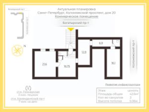 ID: 831817Продается коммерческое помещение свободного назначения 48,7 кв.м в Приморском районе Санкт-Петербурга. На данный момент является продуктовым магазином, можно приобрести вместе с арендатором (8 лет добросовестной аренды). Помещение расположено в 24-этажном жилом доме 2009 года постройки. Окружение объекта составляет преимущественно жилая застройка. В ближайшем окружении располагаются школы, детские сады, магазины, кафе, аптеки. Плотность застройки высокая. У входа бесплатная парковка, свободный проход и проезд со стороны улицы, без шлагбаума и пандуса. Рядом в 50 м остановка общественного транспорта. Интенсивность транспортных и пешеходных потоков непосредственно возле объекта средняя. Ближайшая станция метро ''Комендантский проспект'' расположена на расстоянии 3,8 км. (11 мин. на автомобиле и 20 мин. на автобусе или троллейбусе). Помещение находится в хорошем состоянии с офисной отделкой. Отопление центральное. Высота потолков 2,5 м. Мощность электросети: 4 ( с возможным увеличением).