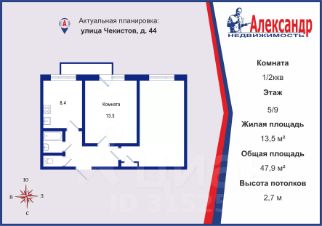 1702726 Уникальное предложение Прямая продажа. Продаётся комната в 2 х комнатной квартире по адресу ул. Чекистов, 44 Идеально подойдет тем, кто ищет: Молодым семьям с ребенком или детьми школьного возраста — отличная альтернатива отдельному жилью для дополнительного пространства. Студентам и аспирантам — тихое и удобное место для учебы и проживания вдали от шумных общежитий. Идеальное предложение для тех, чей ребенок собирается поступать учиться в Санкт-Петербурге.Специалистам и профессионалам среднего звена — удобный вариант недалеко от места работы или в перспективном районе города. Одиноким родителям или пожилым людям — жилье рядом с родственниками или друзьями, позволяющее сохранять независимость и близость с близкими людьми одновременно. Тем, кто мечтает переехать ближе к природе или престижному району. Подходит абсолютно каждому, кто хочет ощутить домашний уют и спокойствие собственного уголка.Удобства и преимущества:- Изолированная комната в квартире, готовая к проживанию.- Квартира оснащена всей необходимой мебелью и бытовой техникой.- Отличное состояние дома и придомовая территория. Учебные заведения рядом:- Средняя общеобразовательная школа 67- Санкт-Петербургский техникум сервиса и туризма (СПбТСиТ)- Филиал Университета Прокуратуры РФ- Северо-Западный институт повышения квалификации ФСКН России- СПбУ МВД России (улица Летчика Пилютова) Транспортная доступность отличная — легко добираться до всех уголков города.Документы готовы. Соседка, женщина.