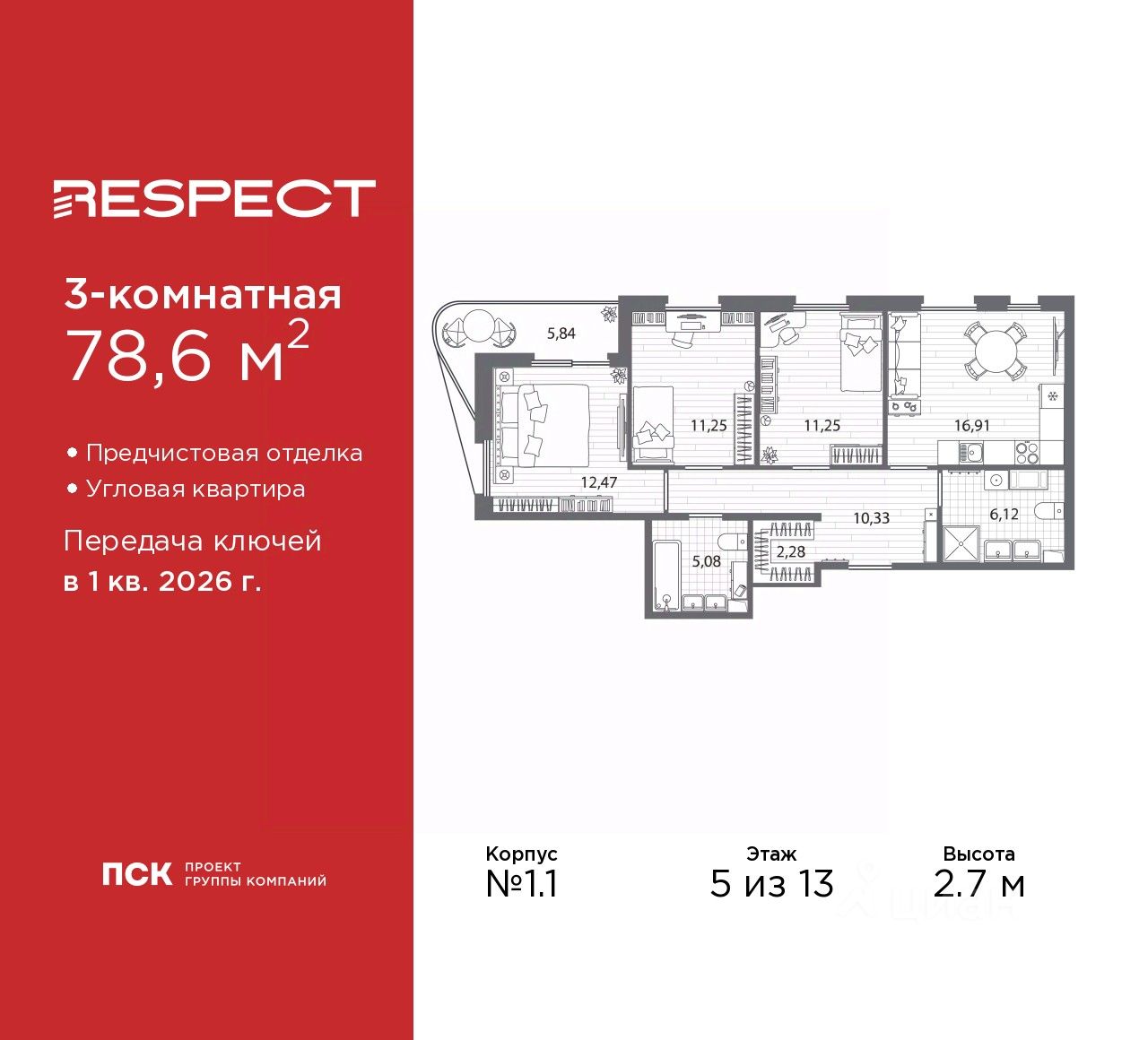 Просторная трехкомнатная квартира с предчистовой отделкой в ЖК ''RESPECT'' на 4 этаже. Общая площадь: 78.6 кв.м., жилая: 34.97 кв.м., площадь просторной кухни-столовой: 16.91 кв.м. Угловая квартира, идеально подойдет любителям тишины и панорамных видов. В квартире один балкон, два совмещенных санузла. Наличие террасы в квартире дает возможность для обустройства дополнительной площади. Высота потолков 2.7 м. Квартира находится в корпусе 1. Дом монолитный, одноподъездный, высотой 13 этажей. На этаже 6 квартир. В подъезде 1 пассажирский и 1 грузовой лифт. Окончание строительства - 1 квартал 2026 года. Оформление сделки по договору долевого участия. В шаговой доступности от дома имеются станции метро (расстояние по прямой): ''Лесная'' (800 м), ''Площадь Мужества'' (1.4 км), ''Выборгская'' (1.9 км), также недалеко от этого корпуса расположены станции метро: ''Академическая'', ''Политехническая''. Жилой квартал ''RESPECT'' строится на Полюстровском пр, 87, в одной из самых востребованных локаций Петербурга. В 10 минутах пешком - метро ''Лесная'' и в 10 минутах на транспорте - Петроградская сторона. Высота домов от 7 до 13 этажей. Квартиры сдаются с отделкой white box и с чистовой отделкой. На территории Respect строится школа на 1125 учащихся и детский сад на 240 мест. Запроектированы собственная газовая котельная, закрытая территория, дворы без машин и подземные паркинги с лифтами. В проекте предусмотрены трапециевидные балконы или остекленные лоджии, которые, с одной стороны, исключают монотонность фасада, являясь декоративными элементами, с другой дополнительным функциональным пространством в квартирах. Цветовая гармония фасадов каждого дома раскрывает характер квартала. Коричневый цвет клинкерного кирпича со структурой водяных штрихов — цвет уюта и безопасности, сдержанности и надёжности. Вентилируемые фасады облицованы клинкерным кирпичом. Его высокая прочность позволяет давать 100 лет гарантии на этот материал. Водопоглощение клинкерного кирпича составляет менее 5%, за счет чего у него высокая теплопроводность и прочность. В квартале запроектированы внутренние закрытые территории дворов домов без доступа автомобилей и безбарьерная среда для велосипедистов и колясок. Предусмотрены IP-домофония с функцией дистанционного открывания калиток и парадных, а также дистанционный сбор показаний счетчиков и мобильное приложение для жителей. Для безопасности жителей квартала - круглосуточное видеонаблюдение и служба охраны. В каждой квартире предусмотрены внешние корзины для кондиционеров. Вся территория квартала будет связана единой концепцией благоустройства, разработанной ландшафтным бюро L.BURO. На эксплуатируемой кровле на уровне первого этажа в домах 1 и 4 будут обустроены общественные видовые террасы. Это станет не только привлекательным местом с красивым видом, но и удобным, многофункциональным пространством. Дизайн парадных зон и входных групп - сочетание лаконичности отделки и декоративных элементов с текстурами из натурального камня и дере