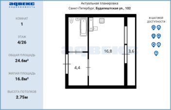 Квартира-студия, 30,7 м², 1/9 эт.Продаётся уютная квартира-студия в Красногвардейском районе Санкт-Петербурга, по адресу 6-я Жерновская ул., д. 7.О квартире:•Общая площадь — 30,7 м²•Жилая площадь — 24 м²•Этаж — 1 из 9•Лоджия застеклена•Дом монолитно-кирпичный, год постройки — 2014О доме и дворе:•9 этажей, пассажирский лифт•Во дворе оборудована детская площадка•Открытая парковка для жителейИнфраструктура и транспорт:•До метро 20 минут на трамвае Чижик•Рядом Ржевский лесопарк — отличное место для прогулок и активного отдыха•Удобный выезд на КАД•В шаговой доступности магазины и остановки транспортаДокументы:•1 собственник•Полная стоимость в договоре•Подходит под ипотеку•Есть небольшая ипотека, будет погашена перед сделкой Отличный вариант как для собственного проживания, так и для сдачи в аренду.Код пользователя: 189373Номер в базе: 9973495