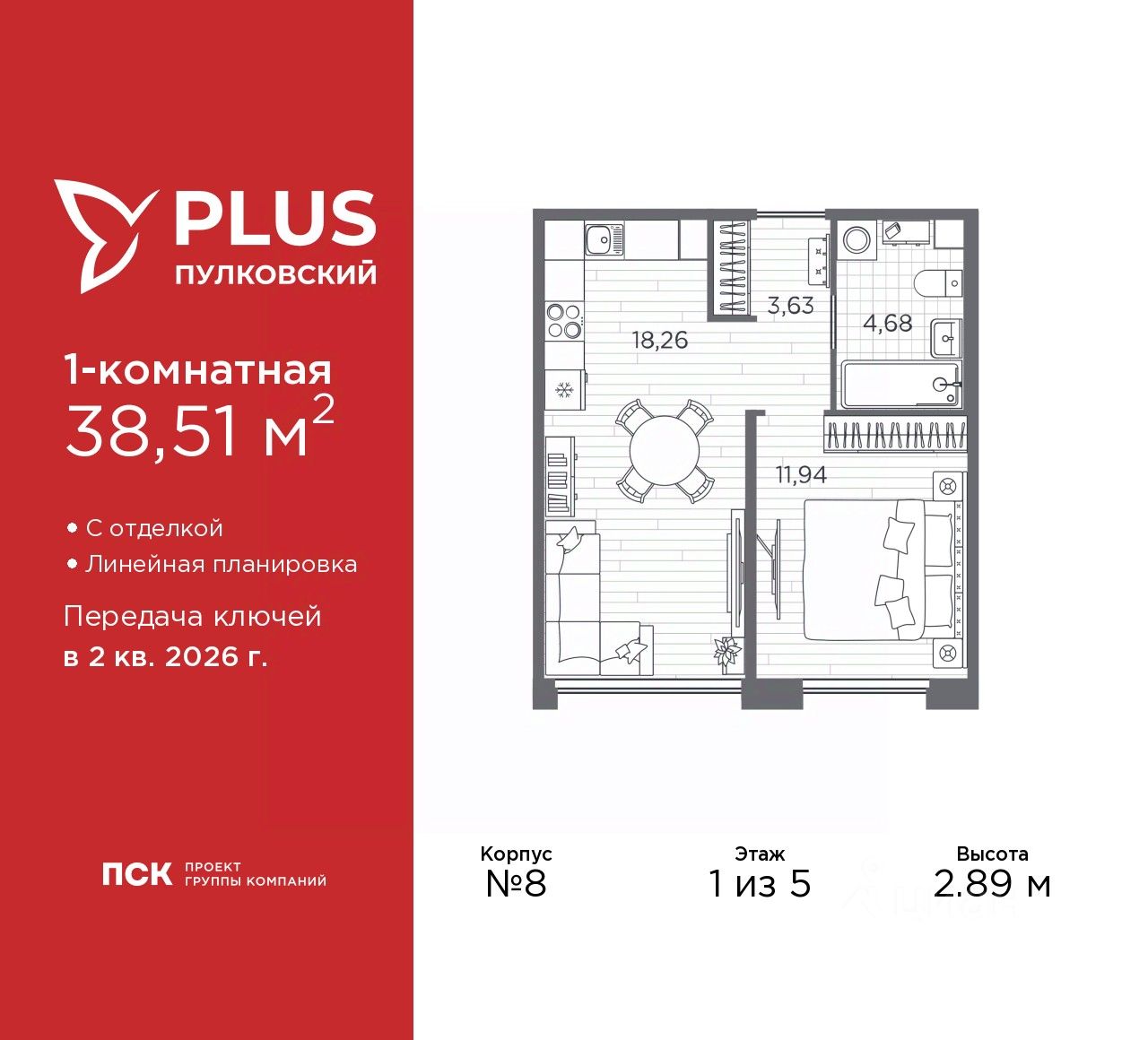 Просторная однокомнатная квартира с отделкой в ЖК ''PLUS Пулковский'' на 1 этаже. Общая площадь: 38.51 кв.м., жилая: 11.94 кв.м., площадь просторной кухни-столовой: 18.26 кв.м. Все окна выходят на одну сторону. В квартире один совмещенный санузел. Высота потолков 2.89 м. Дом монолитный, трехподъездный, высотой 5 этажей. Квартира находится во 2-й секции в корпусе 8. На этаже 7 квартир. В подъезде 1 грузовой лифт. Окончание строительства - 2 квартал 2026 года. Оформление сделки по договору долевого участия. Уютный пятиэтажный city квартал PLUS Пулковский расположен в престижном Московском районе на пересечении Пулковского и Волхонского шоссе в новом формирующемся микрорайоне. Рядом проходит одна из важнейших транспортных артерий города Пулковское шоссе, а в 10 минутах езды два въезда на КАД и въезд на ЗСД. Благодаря удобному и быстрому выезду на Пулковское шоссе, можно легко добраться до центра города за 35 мин. До станций метро ''Московская'' и ''Купчино'' - 15 мин. на машине, а до аэропорта Пулково - 17 мин. В составе квартала: 30 пятиэтажных домов, школа со спортивным стадионом, 2 детских сада с бассейнами, наземные и подземные паркинги, центральный зеленый бульвар с play hub и местами отдыха. Благоустройство квартала продумано до мельчайших деталей, в его основе - забота о качестве жизни каждого жителя. Дома возводятся по современной монолитной технологии строительства с вентилируемыми фасадами. Благодаря большим увеличенным окнам и отсутствию высокоэтажных домов, во всех квартирах максимальный объем естественного света. В составе квартала запланированы социально-значимые объекты: школа на 825 мест со спортивным стадионом и бассейнами, два детских сада с бассейнами на 220 мест каждый. Территория квартала зонирована таким образом, чтобы автомобильные и пешеходные потоки и не пересекались. Прогулочные и велосипедные дорожки отделены от автомобильных проездов зелеными насаждениями. Дворы закрыты для машин, что дает чувство дополнительной безопасности для жителей особенно, для самых маленьких. Вся территория квартала безбарьерная. Здесь нет пандусов, резких перепадов высот или неудобных ступеней. Вход в парадные с уровня земли. В каждом дворе есть своя оборудованная детская площадка. А в центре микрорайона расположится большая игровая площадка play hub с пространством для командных игр. PLUS Пулковский располагается в молодом микрорайоне, который сейчас находится в стадии активного развития. Он будет обладать собственной развитой инфраструктурой. В радиусе 15 минут езды на автомобиле располагаются многочисленные магазины, супермаркеты, спортивные, образовательные и медицинские учреждения, парки и достопримечательности. Для автомашин предусмотрены отдельно стоящий 5-ти этажный паркинг на 958 машино-мест, две подземные парковки на 367 машино-мест и наземные парковочные зоны по внешнему периметру микрорайона. #ZMbT54