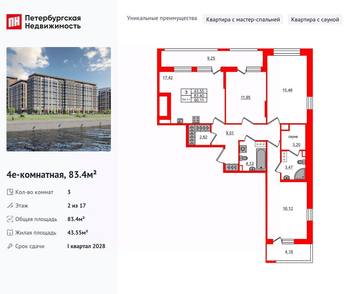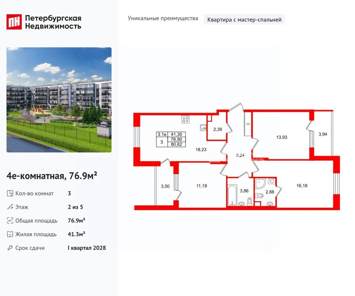 Продается уютная, семейная 3-комнатная квартира от застройщика в жилом комплексе ''Парадный ансамбль'' в престижном Московском районе. До метро можно добраться на транспорте всего за 20 минут. Мастер-спальня с собственной ванной комнатой. Самое приватное пространство в вашей квартире. Уникальная, функциональная европланировка, большая кухня-гостиная 18.23 м², вместительная прихожая 8.24 м². Общая площадь квартиры - 76.9 м², жилая 41.3 м², высота потолка 2.77 м. Квартира продается с отделкой ''Норд Лайн серый''. Что особенного в ЖК ''Парадный ансамбль''? • Инновационный Лицей Setl с оригинальной архитектурной концепцией и уникальной образовательной средой • Масштабное малоэтажное строительство в престижном Московском районе • Рекреационные зоны: парадный парк в центре квартала, ручей с собственной набережной, центральная площадь, ресторанный комплекс и пешеходный бульвар • Фасады из керамогранита и кирпича с яркими и акцентными входными группами • Две самые большие площадки Setl Kids и Setl Sport • Уникальные квартиры.High Flat на последних этажах, палисадники у квартир на первом этаже, семейные секции, квартиры с саунами и окном в ванной