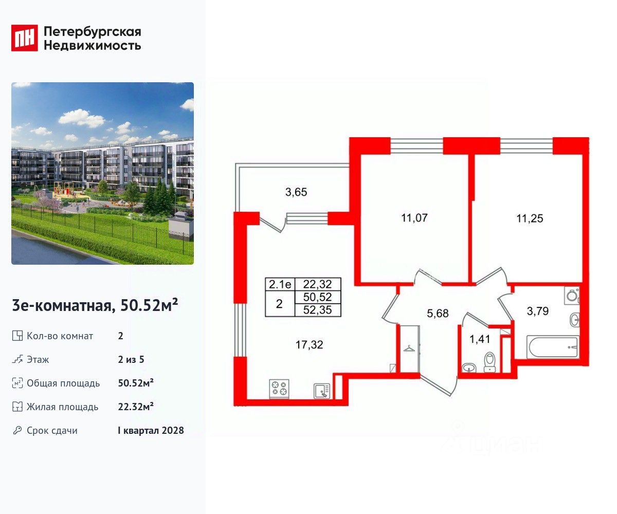 Продается уютная 2-комнатная квартира от застройщика в жилом комплексе ''Парадный ансамбль'' в престижном Московском районе. До метро можно добраться на транспорте всего за 20 минут. Удобная, классическая, функциональная европланировка, большая кухня-гостиная 17.32 м², вместительная прихожая 5.68 м². Общая площадь квартиры - 50.52 м², жилая 22.32 м², высота потолка 2.77 м. Квартира продается с отделкой ''Норд Лайн серый''. Что особенного в ЖК ''Парадный ансамбль''? • Инновационный Лицей Setl с оригинальной архитектурной концепцией и уникальной образовательной средой • Масштабное малоэтажное строительство в престижном Московском районе • Рекреационные зоны: парадный парк в центре квартала, ручей с собственной набережной, центральная площадь, ресторанный комплекс и пешеходный бульвар • Фасады из керамогранита и кирпича с яркими и акцентными входными группами • Две самые большие площадки Setl Kids и Setl Sport • Уникальные квартиры.High Flat на последних этажах, палисадники у квартир на первом этаже, семейные секции, квартиры с саунами и окном в ванной