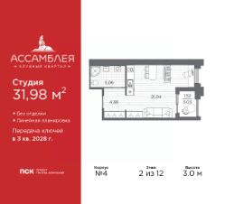 Однокомнатная квартира-студия в Клубный квартал ''Ассамблея'' на 2 этаже. Квартира без отделки, полностью готова к чистовой отделке и дальнейшему ремонту. Общая площадь: 31.98 кв.м., площадь гостиной 21.04 кв.м., из которых 5 кв.м. выделено под кухонную зону. Все окна выходят на одну сторону. В квартире одна лоджия, один совмещенный санузел. Высота потолков 3.0 м. Дом монолитный, трехподъездный, высотой 12 этажей. Квартира находится в 3-й секции в корпусе 4. На этаже 9 квартир. В подъезде 1 пассажирский и 1 грузовой лифт. Начало строительства - 3 квартал 2025 года. Окончание строительства - 3 квартал 2028 года. Оформление сделки по договору долевого участия. В шаговой доступности от жилого комплекса расположены станции метро (расстояние по прямой): ''Горный институт'' (1.0 км), ''Василеостровская'' (1.4 км), ''Приморская'' (1.5 км), также недалеко от этого корпуса расположены станции метро: ''Спортивная'', ''Чкаловская''. ''Клубный квартал Ассамблея'' — проект бизнес-класса на Васильевском острове, в самом сердце исторического Петербурга. Комплекс состоит из пяти корпусов переменной этажности — от 7 до 12 этажей — с выразительной архитектурой в стиле неомодернизма: светлый клинкер, панорамное остекление, просторное лобби с потолками высотой почти 8 метров. Потолки — до 3,2 метров. Подземный паркинг на 667 машиномест. Комфорт и инфраструктура Проект ориентирован на комфортную городскую жизнь. В закрытом дворе — ландшафтное озеленение, современные детские и спортивные площадки. Внутренний клуб для резидентов включает коворкинг, переговорные, кинозал, фитнес и бьюти-зону. IP-домофония с просмотром камер видеонаблюдения, дистанционное открывание дверей и доступа на территорию и в парадную со смартфона и планшета, просмотр показаний счетчиков, приложение для жителей PSK Home. Локация Расположение на Васильевском острове — сильная сторона проекта. До четырех станций метро (''Горный институт'', ''Василеостровская'', ''Спортивная'', ''Приморская'') — 515 минут пешком. В шаговой доступности — зелёные зоны, культурные учреждения, в том числе сад ''Василеостровец'' и ДК имени Кирова. Основные магистрали Большой, Средний и Малый проспекты, Наличная и Уральская улицы. Съезд на ЗСД расположен недалеко от станции метро ''Приморская'', близ береговой линии. Благовещенский и Дворцовый мосты соединяют остров с центром города, а мосты Тучков, Биржевой и Бетанкура — с Петроградской стороной. Застройщик Группа компаний ПСК является одной из ведущих девелоперских компаний Санкт Петербурга. На протяжении 18 лет она возводит в Северной столице качественное жилье премиум, бизнес и комфорт-класса, социальные объекты школы и детские сады, апарт-отели и торговые центры. Является шестикратным обладателем золотого знака ''Надежный застройщик России''. #z6B9WI