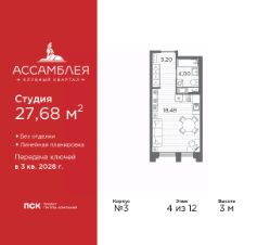 Однокомнатная квартира-студия в Клубный квартал ''Ассамблея'' на 4 этаже. Квартира без отделки, полностью готова к ремонту. Общая площадь: 27.68 кв.м., площадь гостиной 18.48 кв.м., из которых 5 кв.м. выделено под кухонную зону. Все окна выходят на одну сторону. В квартире один совмещенный санузел. Высота потолков 3 м. Дом монолитный, двухподъездный, высотой 12 этажей. Квартира находится во 2-й секции в корпусе 3. На этаже 6 квартир. В подъезде 1 пассажирский и 1 грузовой лифт. Начало строительства - 2 квартал 2025 года. Окончание строительства - 3 квартал 2028 года. Оформление сделки по договору долевого участия. В шаговой доступности от жилого комплекса находятся станции метро (расстояние по прямой): ''Горный институт'' (1.0 км), ''Василеостровская'' (1.4 км), ''Приморская'' (1.5 км), также недалеко от этого корпуса находятся станции метро: ''Спортивная'', ''Чкаловская''. ''Клубный квартал Ассамблея'' — проект бизнес-класса на Васильевском острове, в самом сердце исторического Петербурга. Комплекс состоит из пяти корпусов переменной этажности — от 7 до 12 этажей — с выразительной архитектурой в стиле неомодернизма: светлый клинкер, панорамное остекление, просторное лобби с потолками высотой почти 8 метров. Потолки — до 3,2 метров. Подземный паркинг на 667 машиномест. Комфорт и инфраструктура Проект ориентирован на комфортную городскую жизнь. В закрытом дворе — ландшафтное озеленение, современные детские и спортивные площадки. Внутренний клуб для резидентов включает коворкинг, переговорные, кинозал, фитнес и бьюти-зону. IP-домофония с просмотром камер видеонаблюдения, дистанционное открывание дверей и доступа на территорию и в парадную со смартфона и планшета, просмотр показаний счетчиков, приложение для жителей PSK Home. Локация Расположение на Васильевском острове — сильная сторона проекта. До четырех станций метро (''Горный институт'', ''Василеостровская'', ''Спортивная'', ''Приморская'') — 515 минут пешком. В шаговой доступности — зелёные зоны, культурные учреждения, в том числе сад ''Василеостровец'' и ДК имени Кирова. Основные магистрали Большой, Средний и Малый проспекты, Наличная и Уральская улицы. Съезд на ЗСД расположен недалеко от станции метро ''Приморская'', близ береговой линии. Благовещенский и Дворцовый мосты соединяют остров с центром города, а мосты Тучков, Биржевой и Бетанкура — с Петроградской стороной. Застройщик Группа компаний ПСК является одной из ведущих девелоперских компаний Санкт Петербурга. На протяжении 18 лет она возводит в Северной столице качественное жилье премиум, бизнес и комфорт-класса, социальные объекты школы и детские сады, апарт-отели и торговые центры. Является шестикратным обладателем золотого знака ''Надежный застройщик России''. #zmBVd3