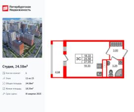 Продается просторная студия от застройщика в жилом комплексе ''Город звезд'' в новом городе на правом берегу Невы.До метро можно добраться на транспорте всего за 13 минут.Удобная, классическая, функциональная европланировка, вместительная прихожая 3 м². Общая площадь студии - 24.58 м², жилая 18.33 м², высота потолка 2.77 м.Квартира продается с отделкой ''NORD LINE WHITE''Что особенного в ЖК ''Город звезд''?• Инновационный Лицей Setl с оригинальной архитектурной концепцией и уникальной образовательной средой• Невский лесопарк под окнами - всегда свежий воздух и полноценный отдых на природе• Четыре тематические площади отдыха с разнообразным благоустройством• Аллея Звёзд - променад протяженностью 5 км с ландшафтным озеленением, зонами отдыха и велодорожкой• Выход на набережную реки Утки, где можно порыбачить или взять напрокат лодку• Единая входная группа с ресепшен и подземный паркинг