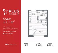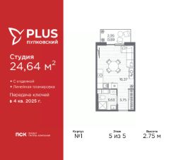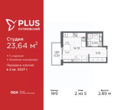 Однокомнатная квартира-студия от застройщика с отделкой в ЖК ''PLUS Пулковский'' на 2 этаже. Общая площадь: 23.64 кв.м., площадь гостиной 14.7 кв.м., из которых 5 кв.м. выделено под кухонную зону. Все окна выходят на одну сторону. В квартире один балкон, один совмещенный санузел. Высота потолков 2.89 м. Дом монолитный, трехподъездный, высотой 5 этажей. Квартира находится в 3-й секции в корпусе 9. На этаже 8 квартир. В подъезде 1 грузовой лифт. Окончание строительства - 2 квартал 2027 года. Оформление сделки по договору долевого участия. ЖК ''PLUS Пулковский'' расположен в престижном Московском районе на пересечении Пулковского и Волхонского шоссе, по которым можно быстро добраться до КАД и до станций метро Московская и Звёздная. Поблизости расположены дворцово-парковые ансамбли Пушкина, Павловска, Петергофа, Гатчины, Ломоносова, а также вся торговая и развлекательная инфраструктура: ТК Лето, Outlet Village Pulkovo, Пулково-3, гипермаркеты Лента, Окей, Metro. На территории комплекса будут построены средняя образовательная школа на 825 мест с двумя бассейнами, 2 детских сада на 220 мест каждый. В детских садах тоже будут бассейны. Кроме этого будет построен медицинский центр для взрослых и детей. Во дворах буду оборудованы спортивные и безопасные детские площадки, на первых этажах домов будут расположены коммерческие помещения. Для автолюбителей будут подземные и наземный паркинги. Для жителей домов будет доступно ''приложение жителя'', которое предоставит такие возможности:— дистанционное открытие дверей в парадную и на территорию комплекса,— просмотр изображений с видеокамер,— контроль за показаниями счетчиков,— коммуникация с УК.Показания всех счетчиков будут собираться дистанционно.В квартирах будет выполнена коллекторная разводка отопления в стяжке пола от коллекторов в межквартирных коридорах. Застройщик ЖК ''PLUS Пулковский'' - группа компаний ПСК, которая является одной из ведущих девелоперских компаний Санкт Петербурга. Более 16 лет она возводит в Северной столице качественное жилье премиум, бизнес и комфорт-класса, социальные объекты школы и детские сады, апарт-комплексы и торговые центры и является четырехкратным обладателем золотого знака ''Надежный застройщик России''. #2mBT2I